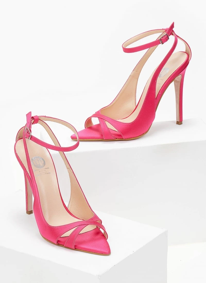 TFP μυτερά σατέν πέδιλα. Έχουν χιαστί λουράκια και δένουν στο ύψος του αστραγάλου. Δερμάτινος πάτος. Ελληνικής κατασκευής.