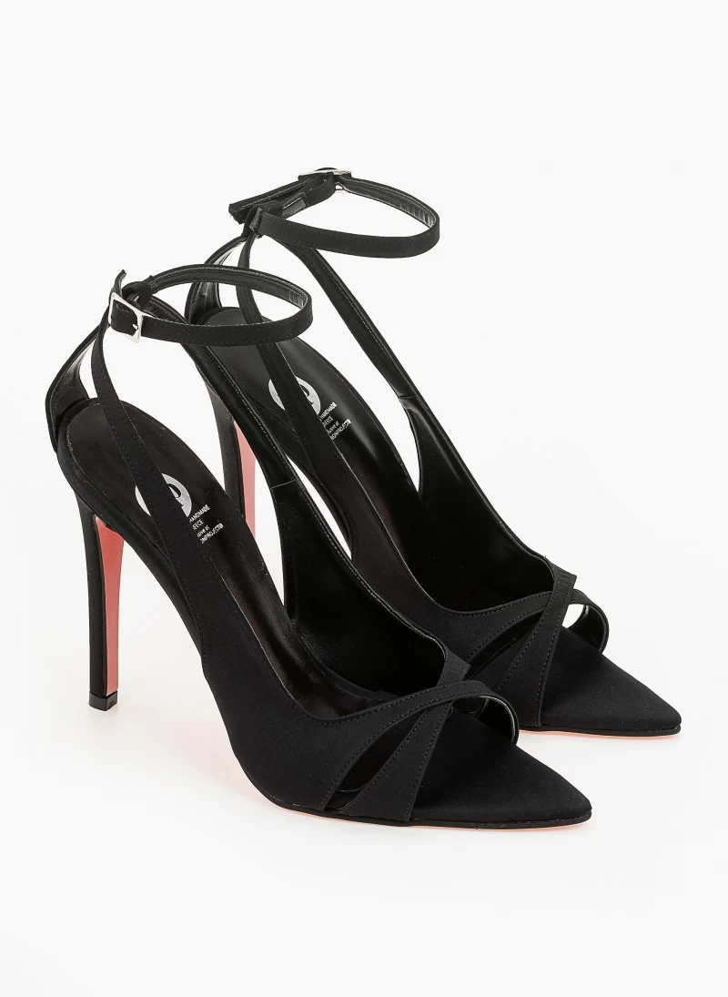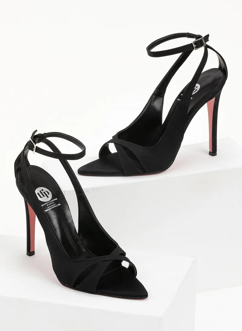 TFP μυτερά σατέν πέδιλα. Έχουν χιαστί λουράκια και δένουν στο ύψος του αστραγάλου. Δερμάτινος πάτος. Ελληνικής κατασκευής.