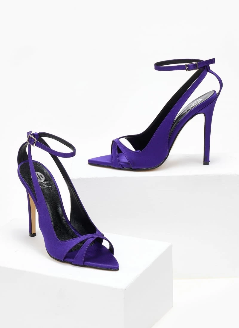 TFP μυτερά σατέν πέδιλα. Έχουν χιαστί λουράκια και δένουν στο ύψος του αστραγάλου. Δερμάτινος πάτος. Ελληνικής κατασκευής.