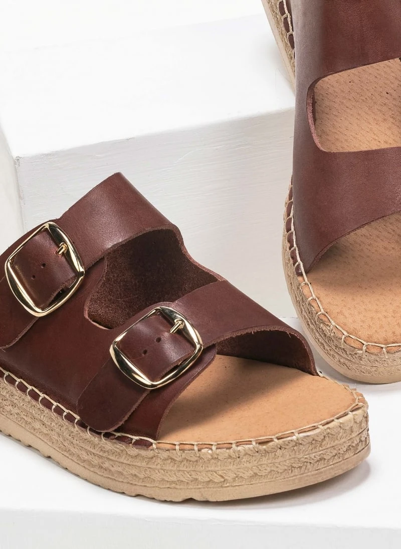 Estil δερμάτινα flatforms με δύο φάσες και μεταλλικές αγκράφες.Οπάτος είναι δερμάτινος με ενίσχυση.Ελληνικής κατασκευής,χειροποίητα.