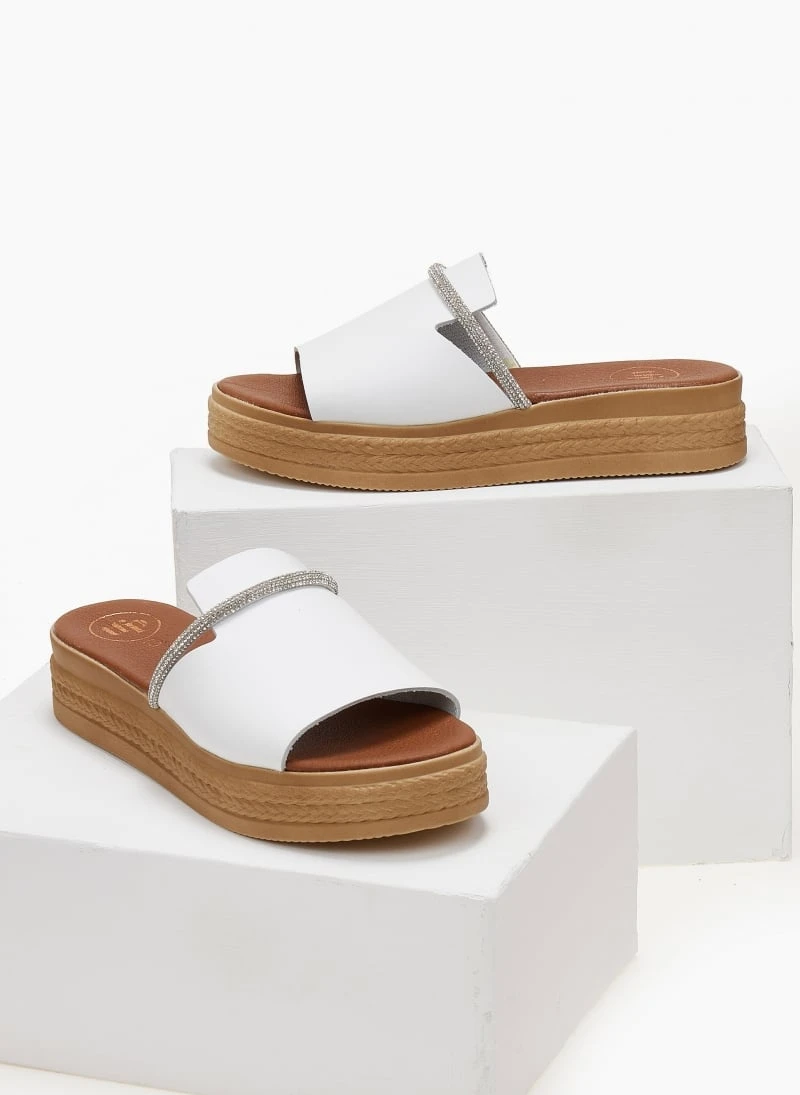 Flatforms δερμάτινα TFP με φαρδιά χωστή φάσα και strass λουράκι. Δερμάτινος πάτος με ενίσχυση. Ελληνικής κατασκευής.