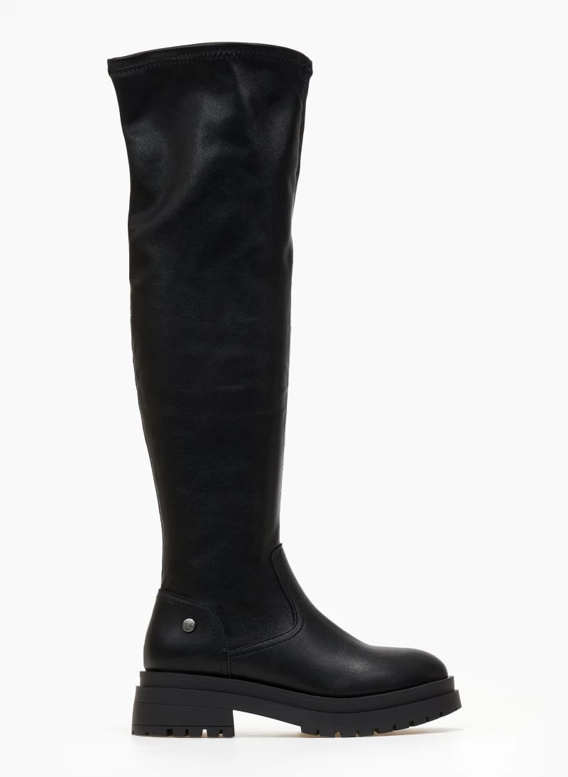 Μπότες casual πάνω από το γόνατο Refresh. Εφαρμοστή γραμμή στη γάμπα. Στρογγυλή γραμμή. Ψηλή τρακτερωτή σόλα. Peta-Vegan approved.