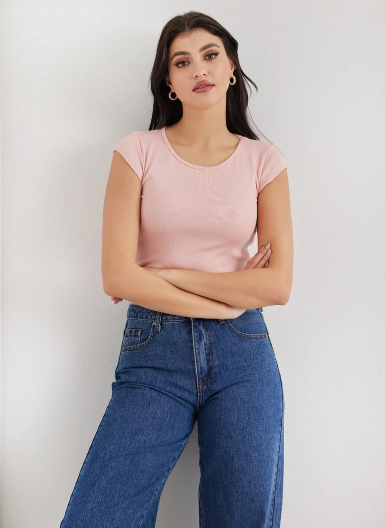 Μπλούζα ριπ με κοφτό μανίκι. Έχει ίσια γραμμή και στρογγυλή λαιμόκοψη. Ελληνικής ραφής.