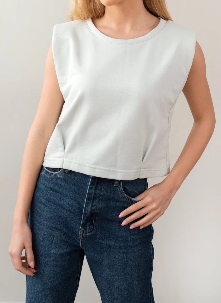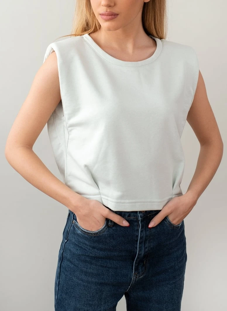 Basic αμάνικο cropped μπλουζάκι με βάτες.Έχει διακριτικές πιέτες στη μπροστινή πλευρά.