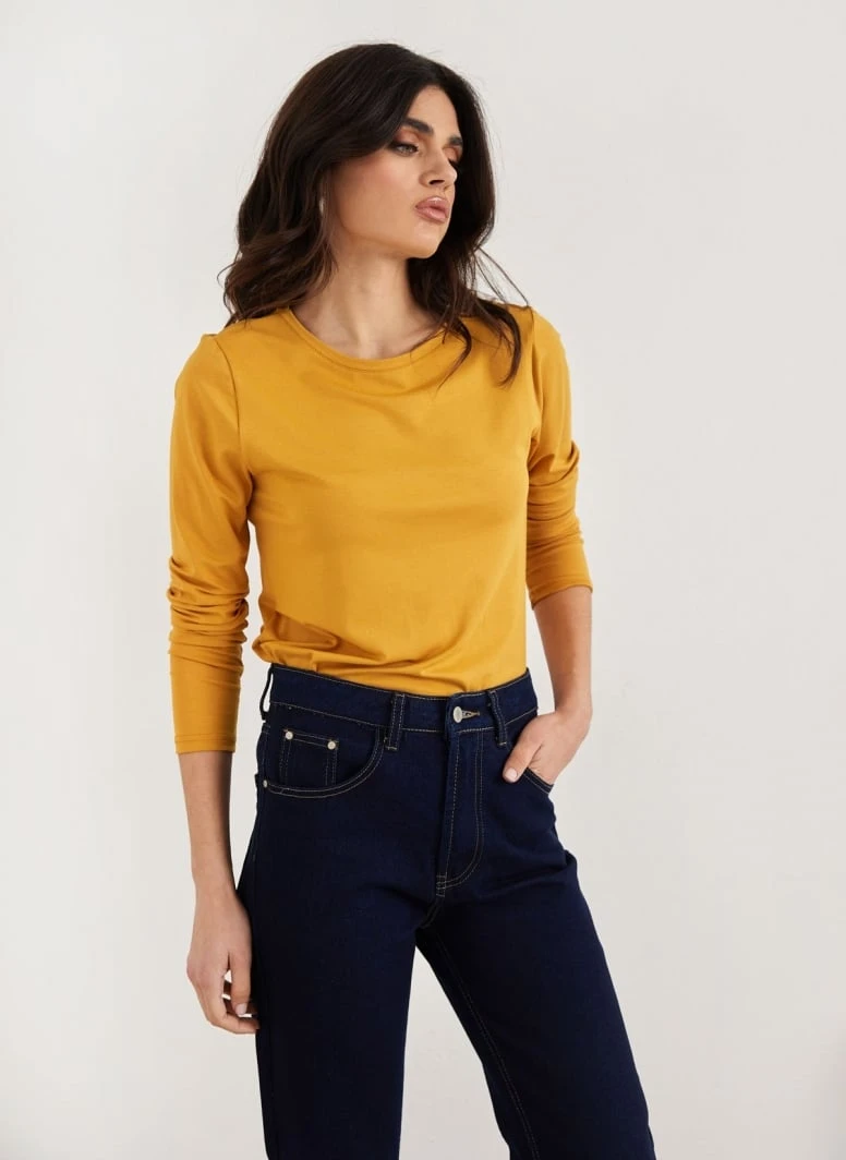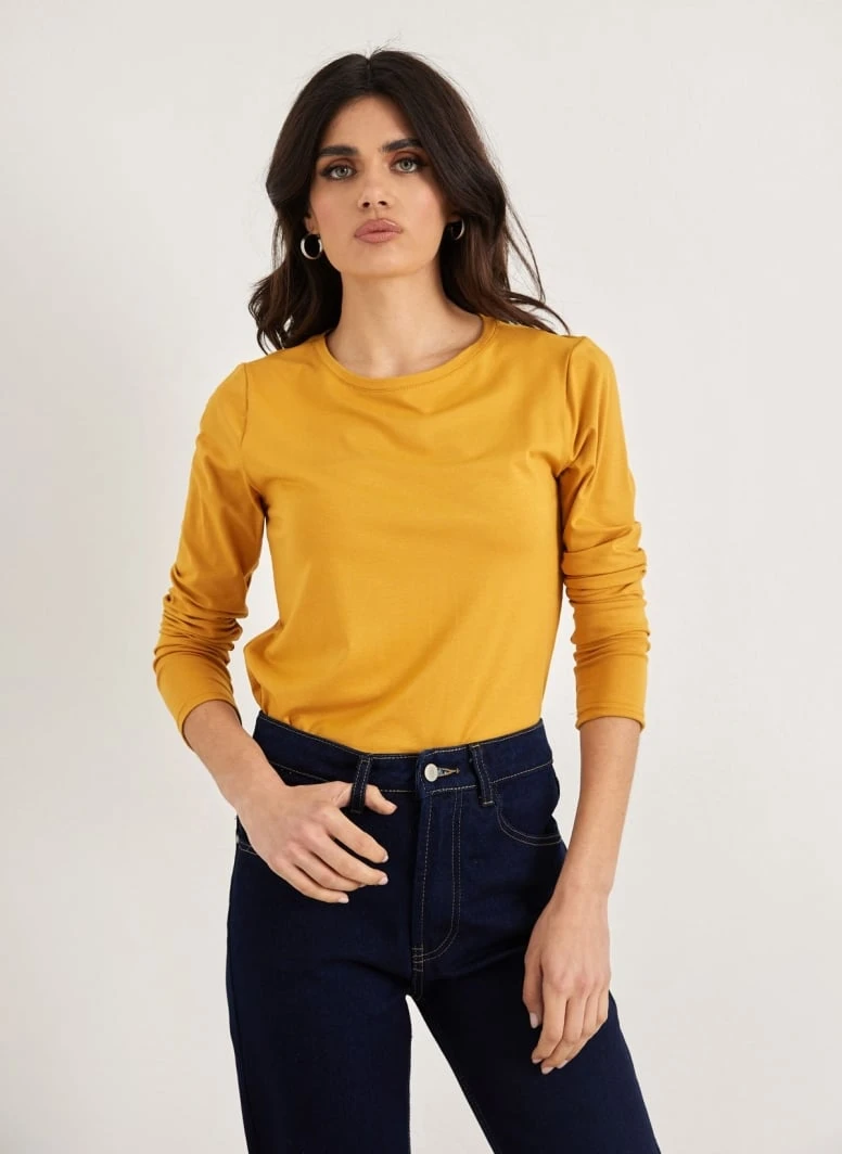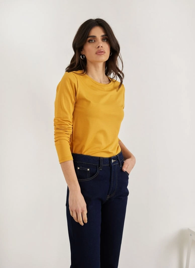 Μπλούζα μακρυμάνικη μονόχρωμη. Έχει στρογγγυλή λαιμόκοψη. Ίσια γραμμή.