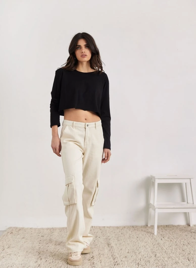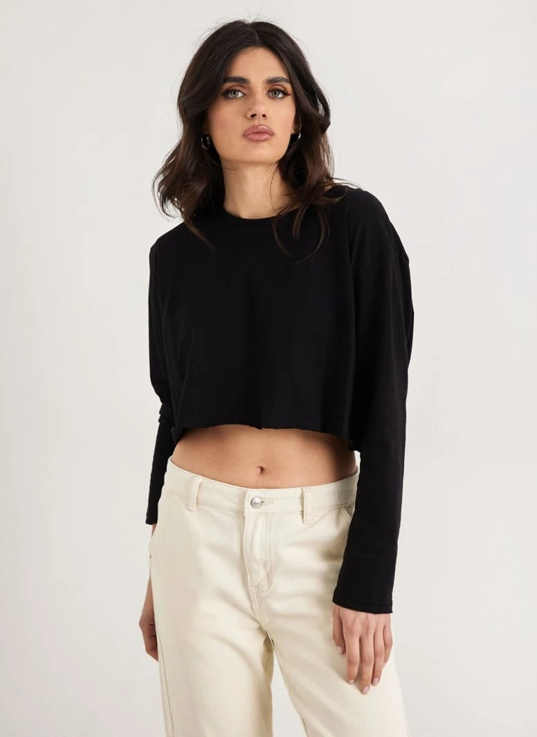 Crop top μπλούζα μακρυμάνικη. Έχει στρογγυλή λαιμόκοψη. Basic, μονόχρωμο.