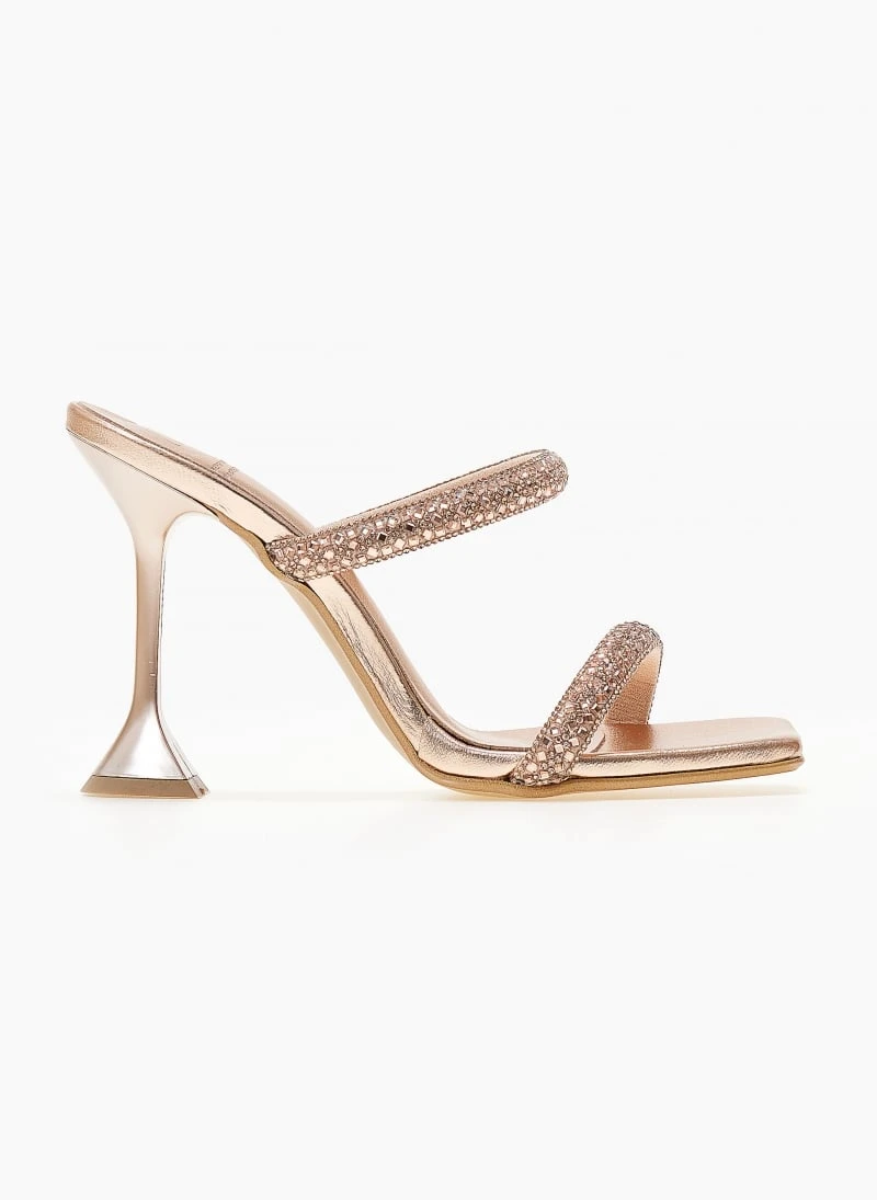 Πέδιλα δερμάτινα TFP με κρύσταλλα στα λουράκια. Έχουν λεπτό τακούνι με ιδιαίτερο τελείωμα. Δερμάτινος πάτος με ενίσχυση. Καρέ γραμμή. Ελληνικής κατασκευής.