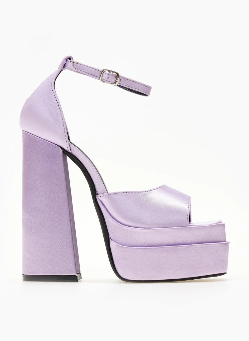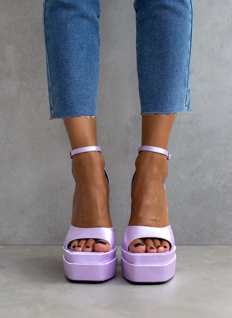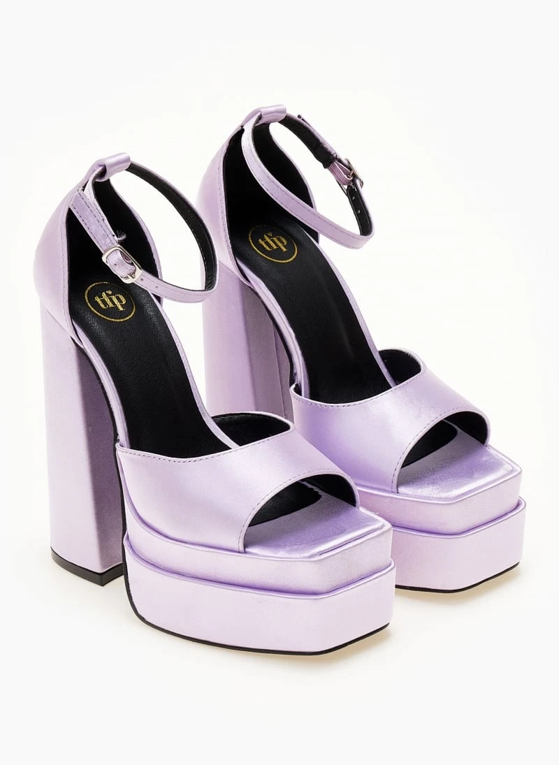 Πέδιλα platform σατέν TFP.Έχουν ψηλή φιάπα και χοντρό τακούνι. Κλειστή φτέρνα. Δένουν με μπαρέτα στο ύψος του αστραγάλου. Καρέ γραμμή.