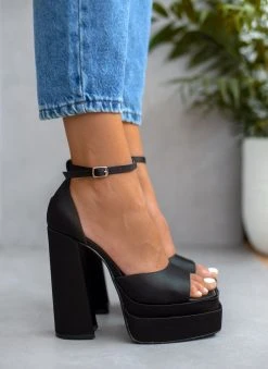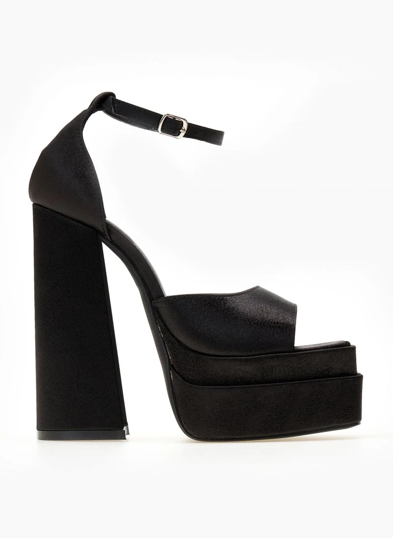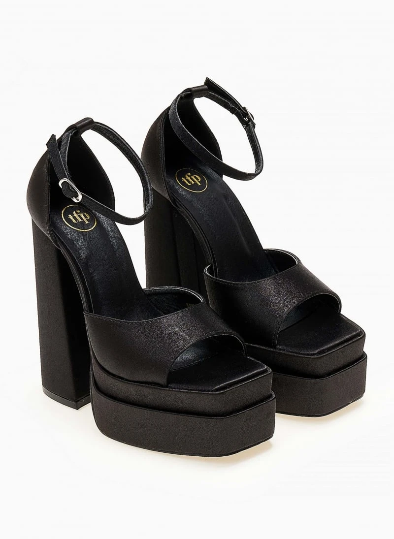 Πέδιλα platform σατέν TFP.Έχουν ψηλή φιάπα και χοντρό τακούνι. Κλειστή φτέρνα. Δένουν με μπαρέτα στο ύψος του αστραγάλου. Καρέ γραμμή.