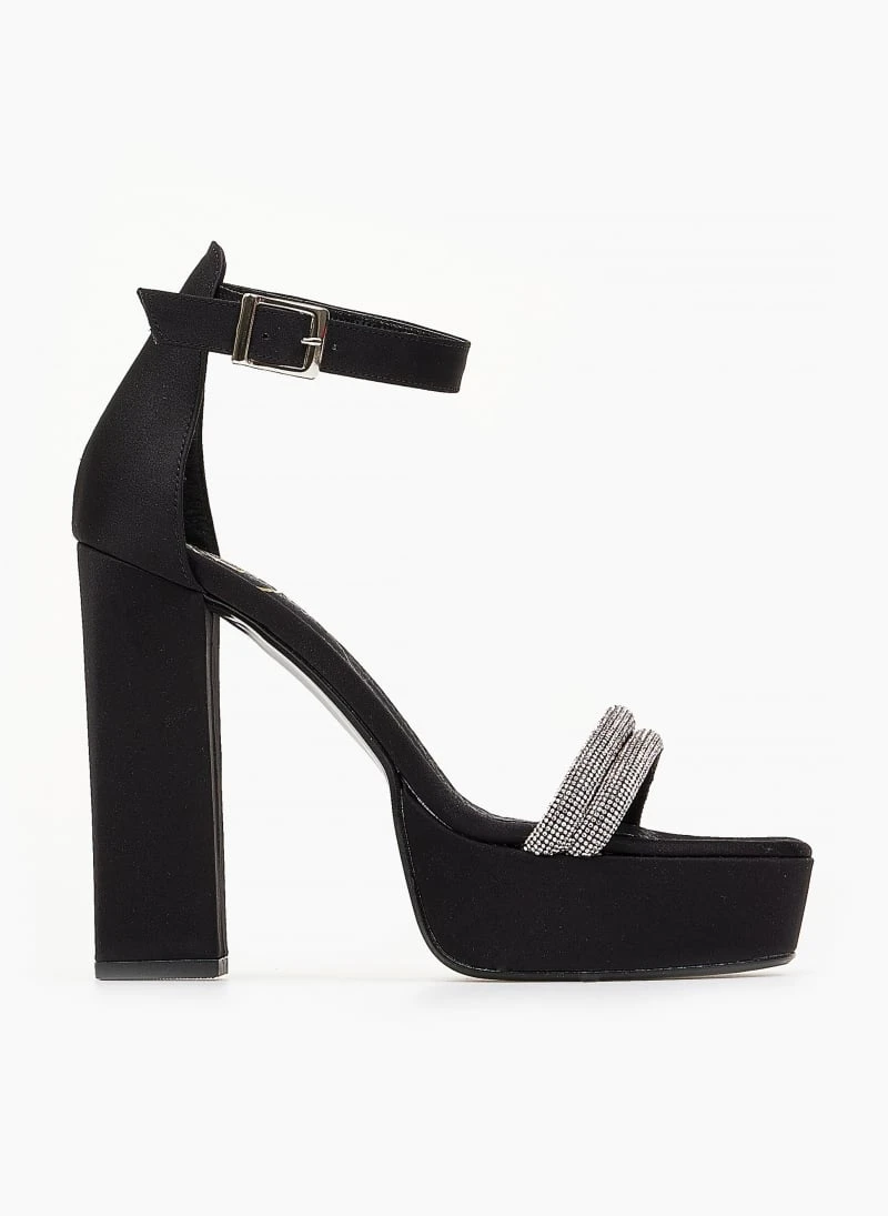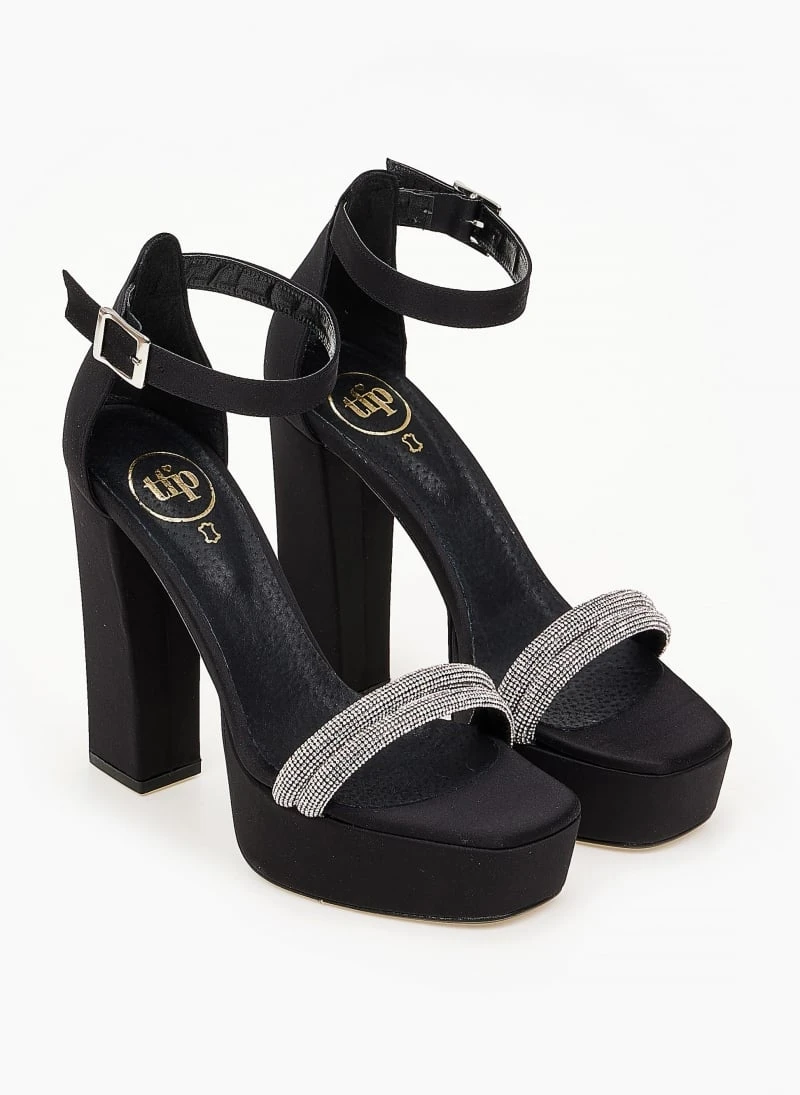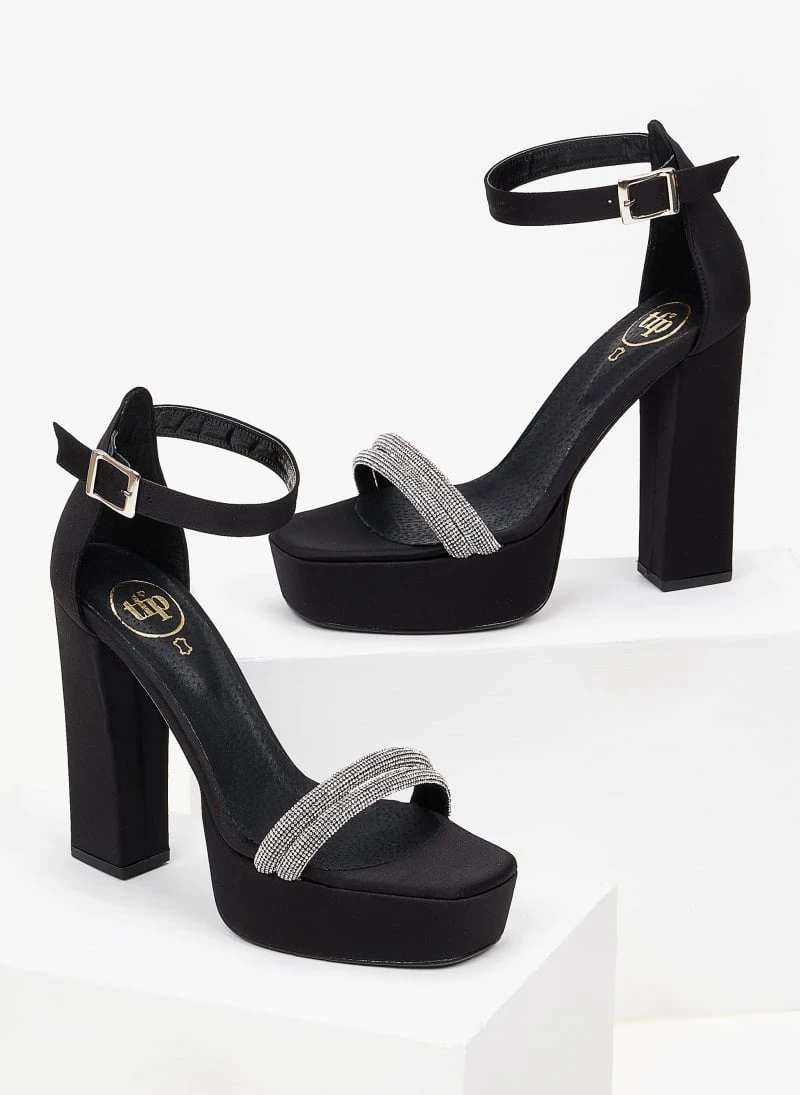 Πέδιλα σατέν TFP με φιάπα και ψηλό τετράγωνο τακούνι. Έχουν διπλό λουράκι με strass. H φτέρνα είναι κλειστή. Δένουν με μπαρέτα στο ύψος του αστραγάλου. Δερμάτινος πάτος. Ελληνικής κατασκευής.