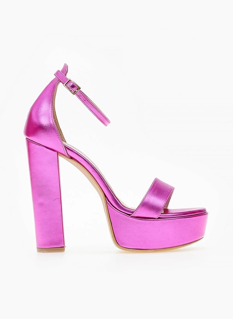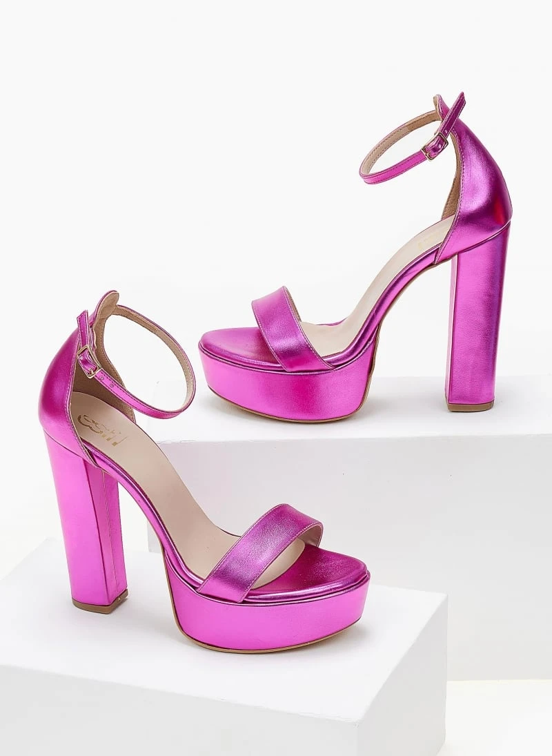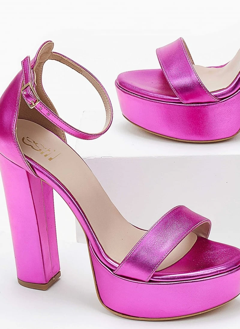 Πέδιλα Estil σε μεταλλικά χρώματα. Έχουν φιάπα και ψηλό χοντρό τακούνι. Η φτέρνα είναι κλειστή. Δένουν με μπαρέτα στο ύψος του αστραγάλου. Ελληνικής κατασκευής.