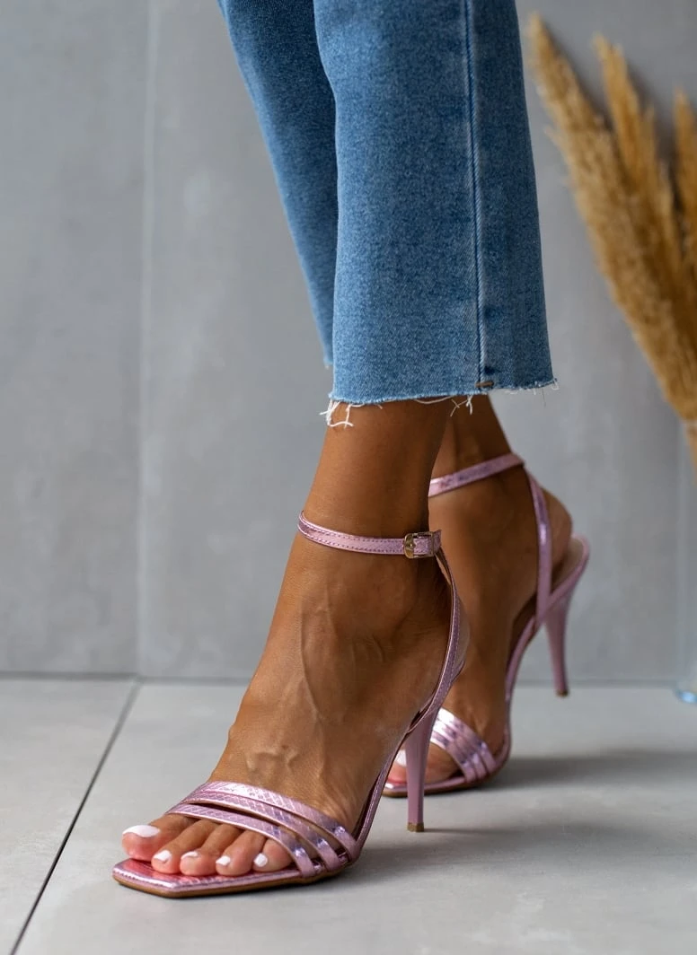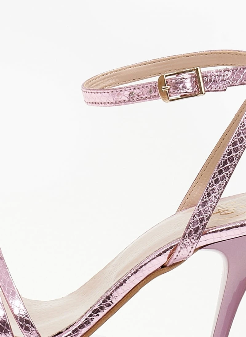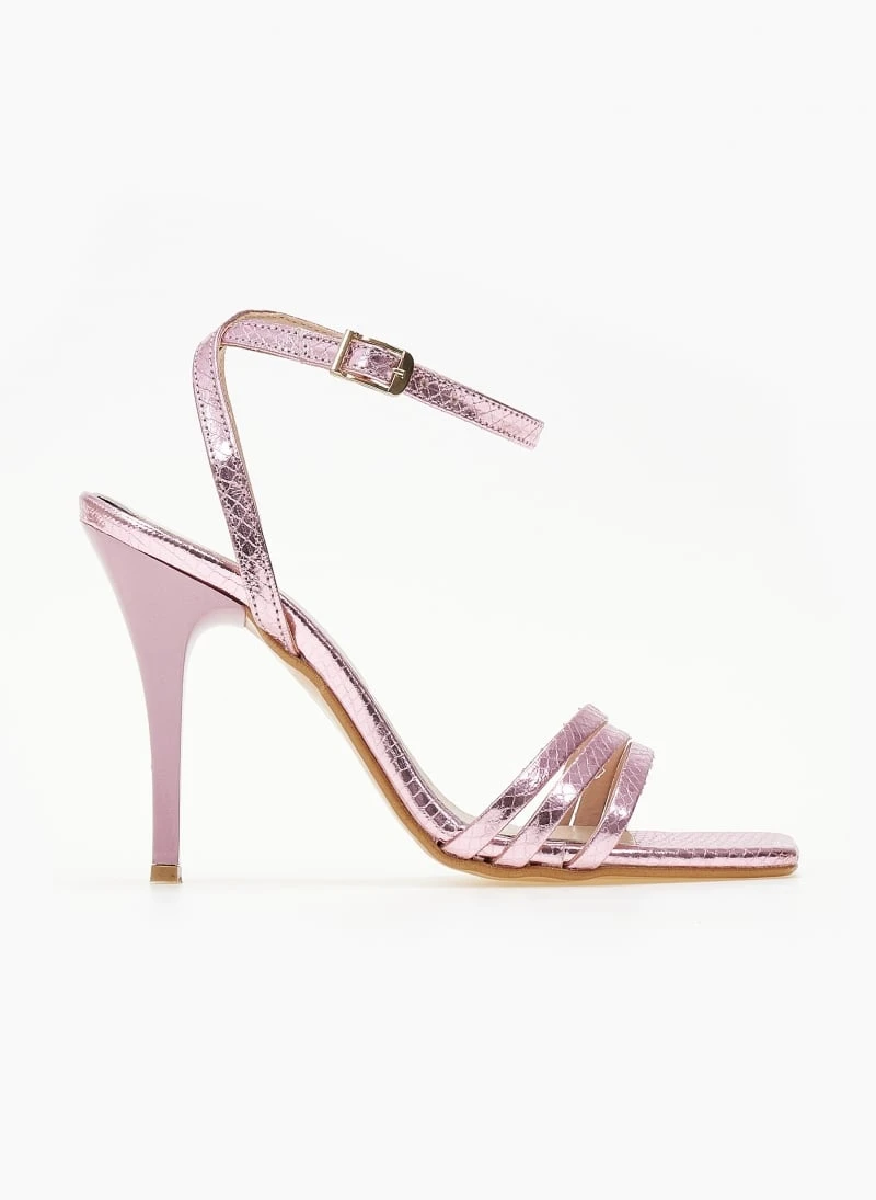 Πέδιλα TFP με λεπτά λουράκια και pattern φίδι. Δένουν με μπαρέτα στο ύψος του αστραγάλου. Έχουν λεπτό τακούνι. Καρέ γραμμή. Δερμάτινος πάτος. Ελληνικής κατασκευής.