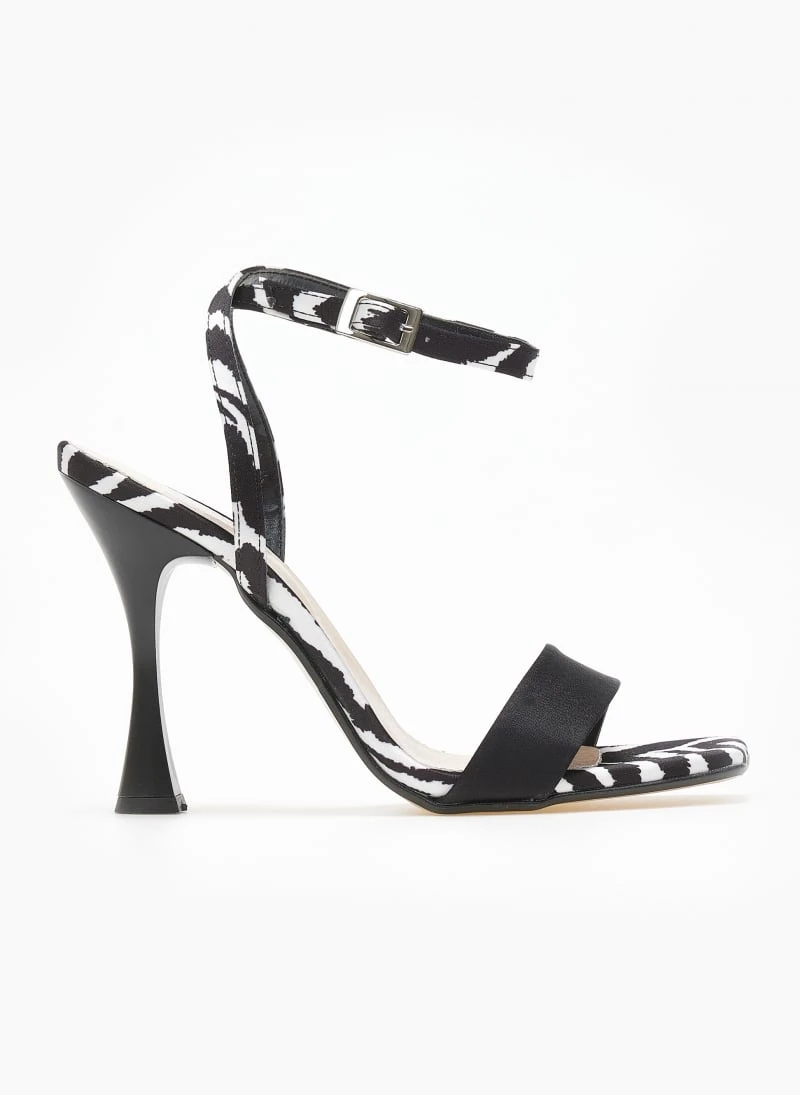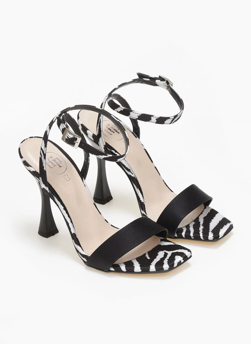 Πέδιλα σατέν tfp με print λεπτομέρεια. Λεπτή φάσα στα δ’ακτυλα. Δένουν με μπαρέτα στο ύψος του αστραγάλου. Λεπτό ψηλό τακούνι. Δερμάτινος πάτος. Ελληνικής κατασκευής.