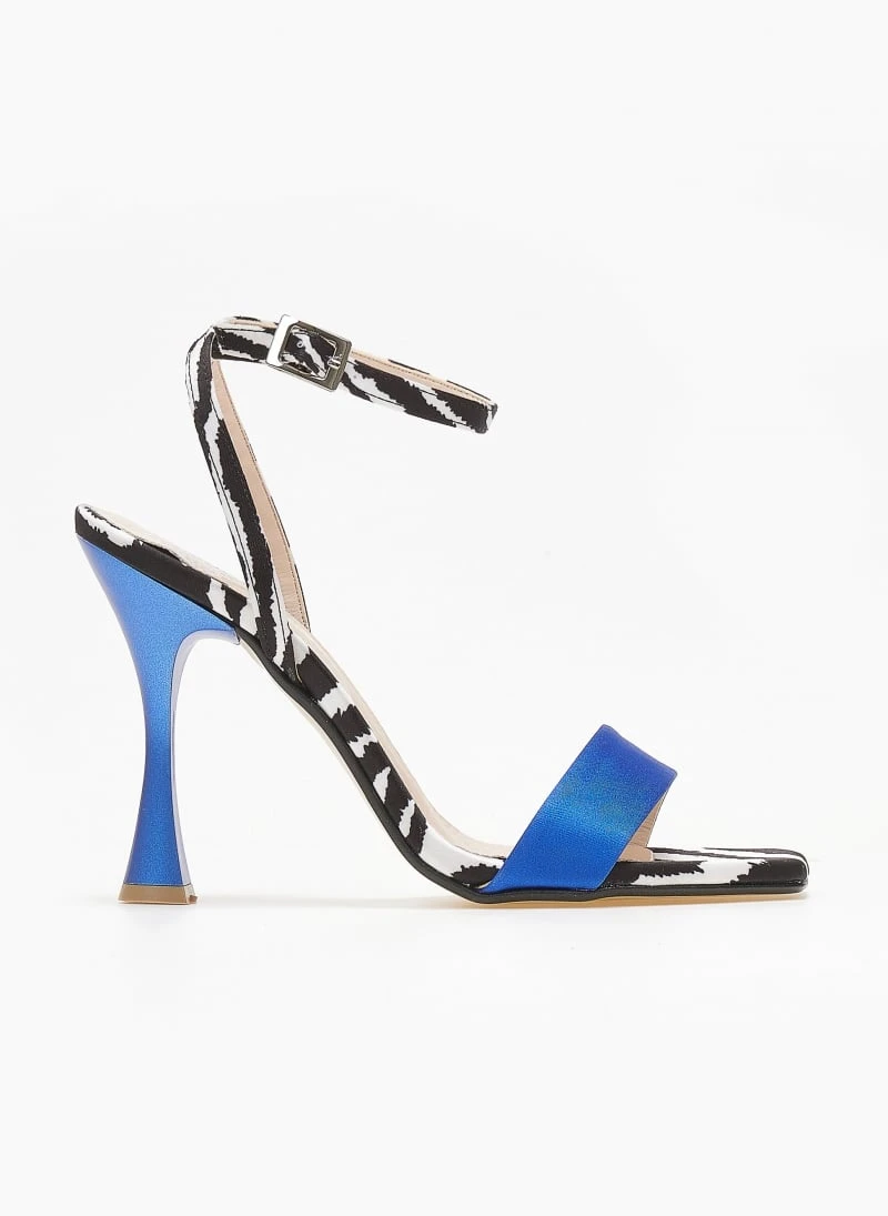 Πέδιλα σατέν tfp με print λεπτομέρεια. Λεπτή φάσα στα δ’ακτυλα. Δένουν με μπαρέτα στο ύψος του αστραγάλου. Λεπτό ψηλό τακούνι. Δερμάτινος πάτος. Ελληνικής κατασκευής.