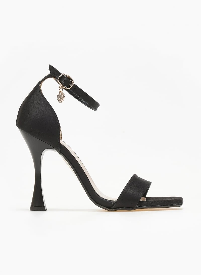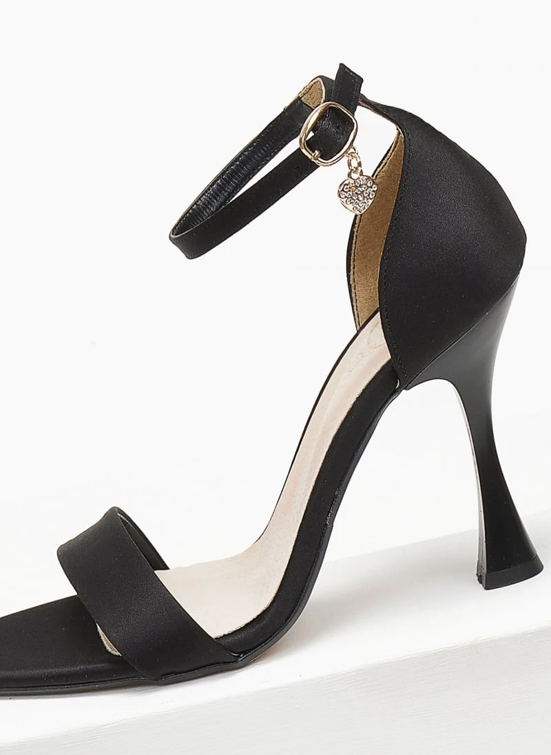 TFP σατέν πέδιλα. Έχουν κλειστή φτέρνα. Δένουν με μπαρέτα στο ύψος του αστραγάλου. Στη μπαρέτα έχει διακοσμητική καρδιά με στράς. Καρέ γραμμή. Δερμάτινος πάτος. Ελληνικής κατασκευής.