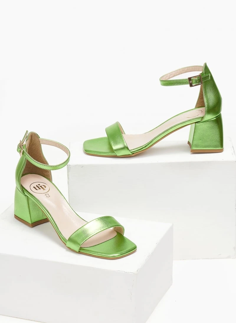 Πέδιλα σε μεταλλικά χρώματα tfp. Έχουν κλειστή φτέρνα. Δένουν με μπαρέτα στο ύψος του αστραγάλου. Καρέ γραμμή. Δερμάτινος πάτος. Ελληνικής κατασκευής.