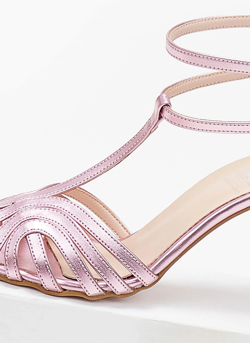 Πέδιλα TFP RETRO σε μεταλλική απόχρωση με ανοίγματα. Έχουν λεπτό ψηλό τακούνι. Δένουν με διπλή μπαρέτα στο ύψος του αστραγάλου. Ελληνικής κατασκευής.