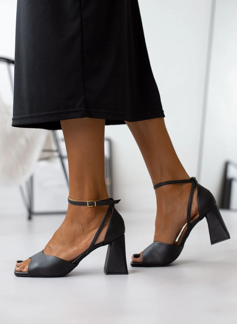 Πέδιλα με τακούνι καμπάνα. Έχουν κλειστή φτέρνα. Δένουν με περαστό λουράκι στο ύψος του αστραγάλου. Διαθέτουν ανατομικό μαξιλαράκι στον πάτο. Λάστιχο στη σόλα. Καρέ γραμμή.
