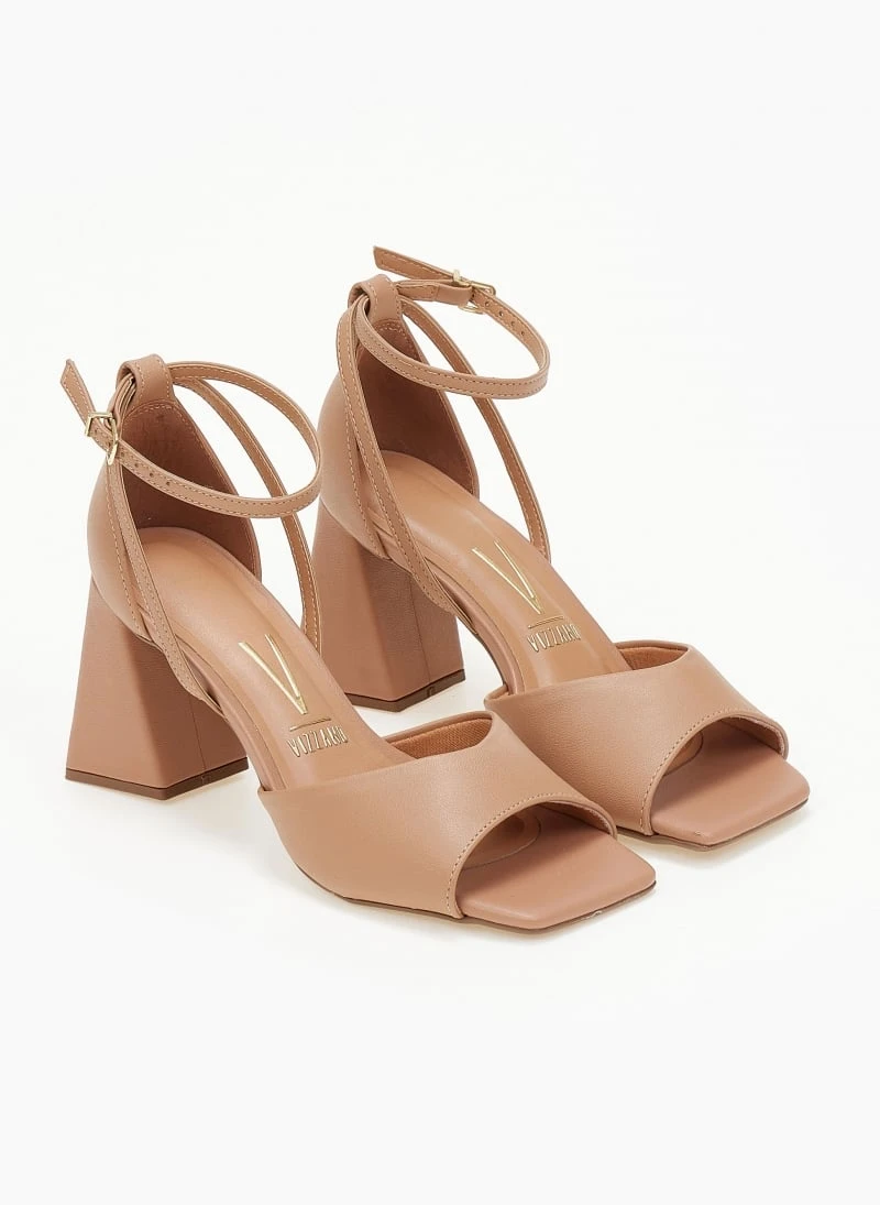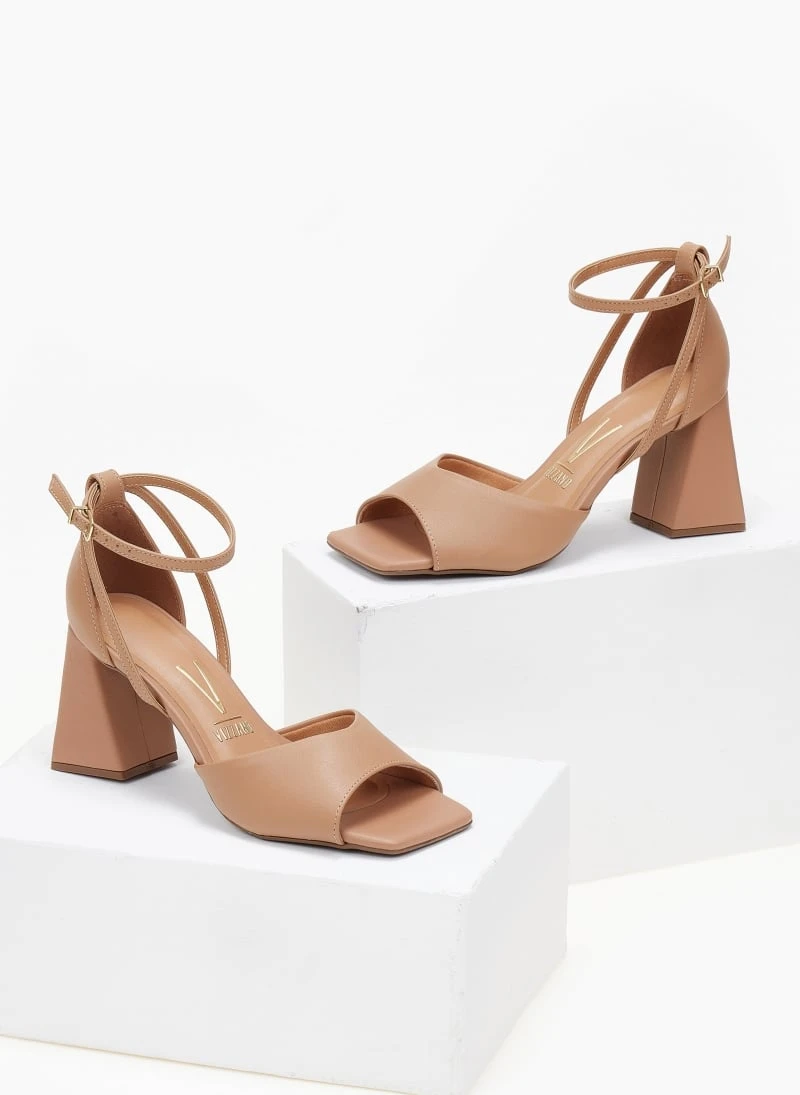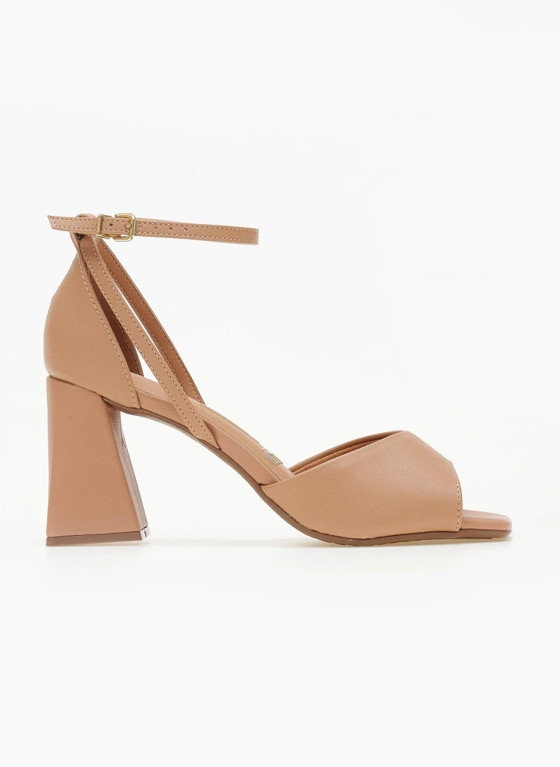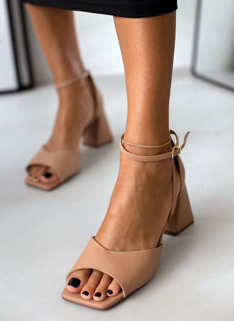 Πέδιλα με τακούνι καμπάνα. Έχουν κλειστή φτέρνα. Δένουν με περαστό λουράκι στο ύψος του αστραγάλου. Διαθέτουν ανατομικό μαξιλαράκι στον πάτο. Λάστιχο στη σόλα. Καρέ γραμμή.