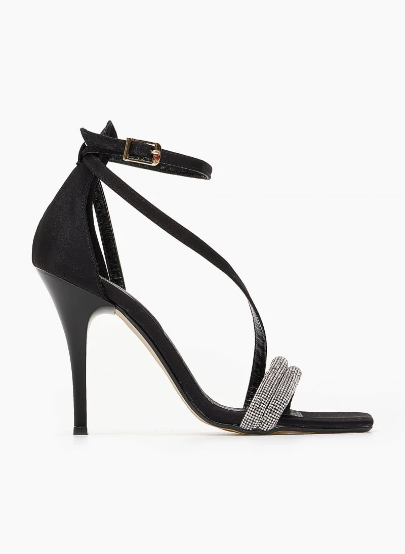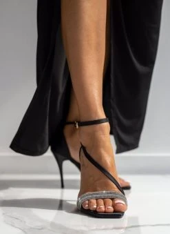 Πέδιλα σατέν TFP με διπλή σειρά strass. Έχουν κλειστή φτέρνα και ψηλό τακούνι. Δένουν με μπαρέτα στο ύψος του αστραγάλου. Καρέ γραμμή. Δερμάτινος πάτος. Ελληνικής κατασκευής.