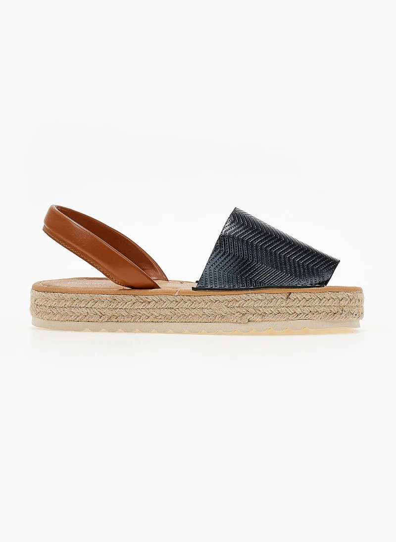 Εσπαντρίγιες δερματίνη με ανάγλυφο pattern. Έχουν σχοινί στη σόλα. Ανοιχτό πίσω μέρος με λουράκι. Μικρό άνοιγμα στη μπροστινή πλευρά.