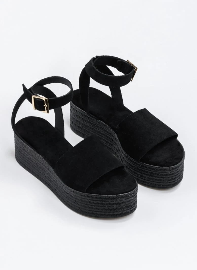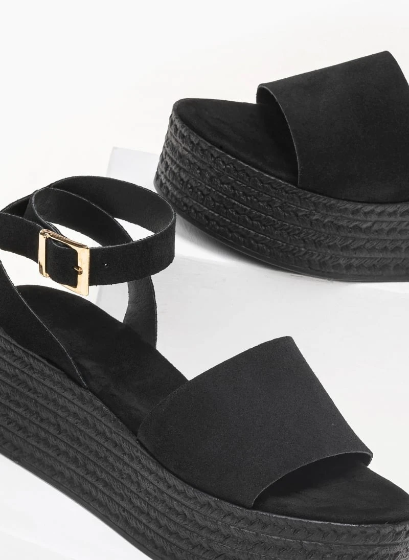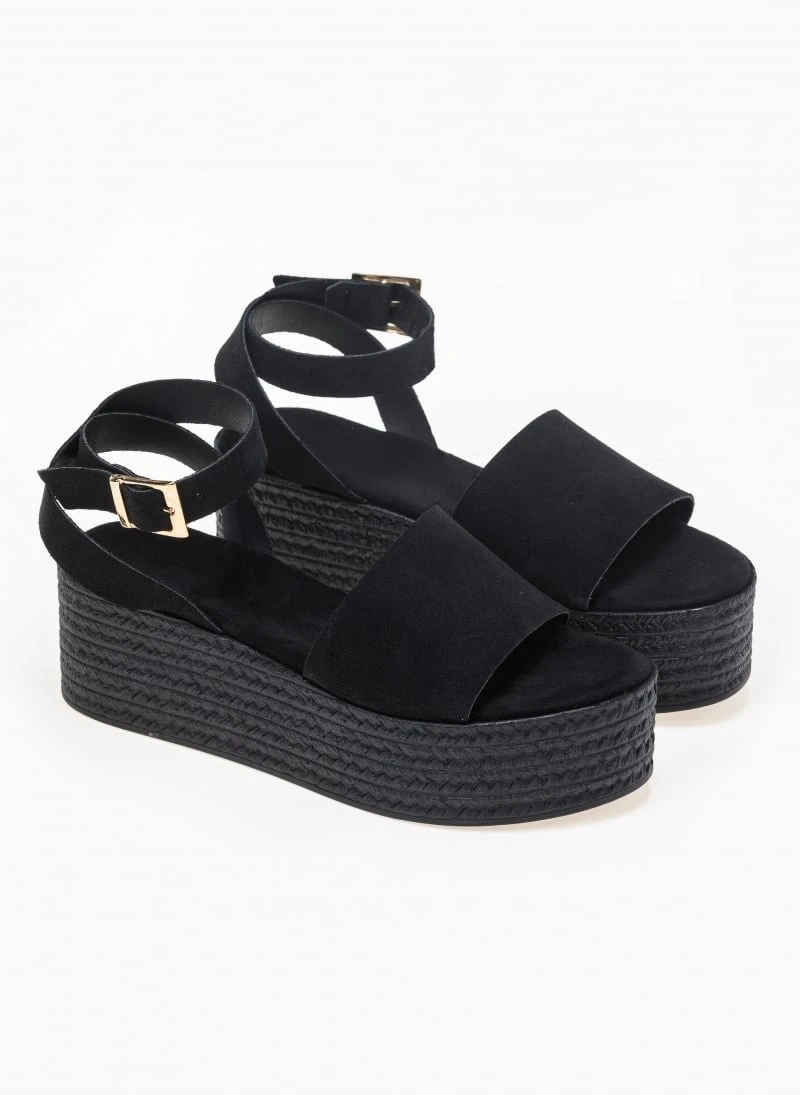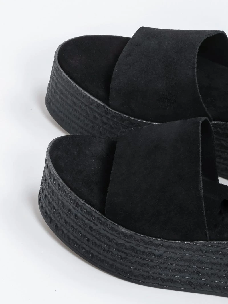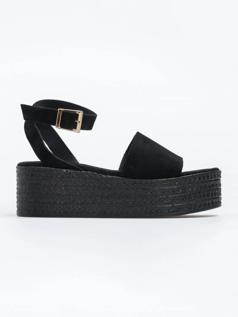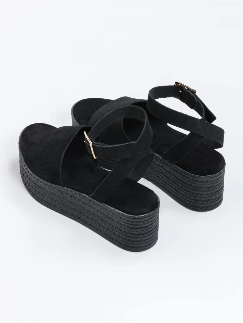 Πέδιλα πλατφόρμες με φαρδιά φάσα από δέρμα καστόρι. Δένουν με λουράκια στο ύψος του αστραγάλου. Ο πάτος είναι μαλακός από suede. Eλληνικής κατασκευής.