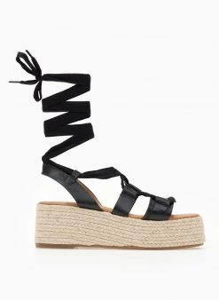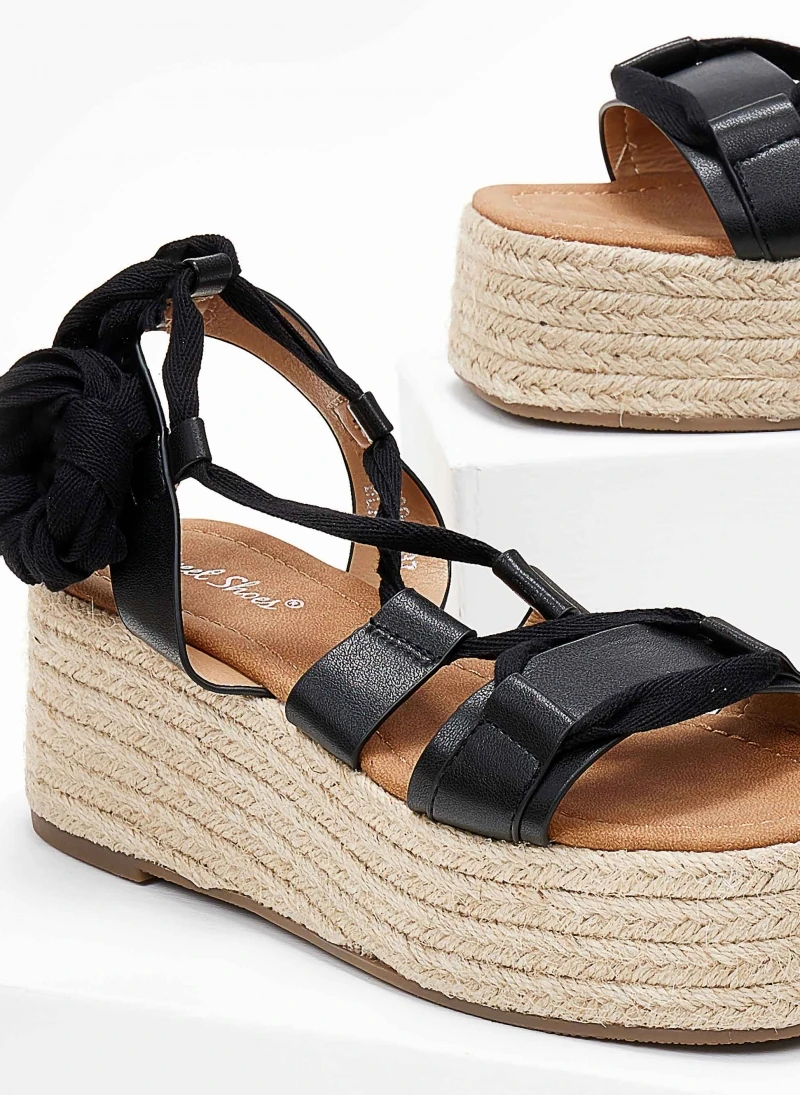 Flatforms με σχοίνινη σόλα. Δένουν με κορδόνια σττη γάμπα. Έχουν καρέ γραμμή.