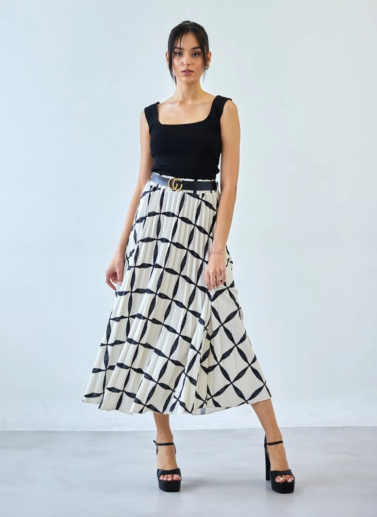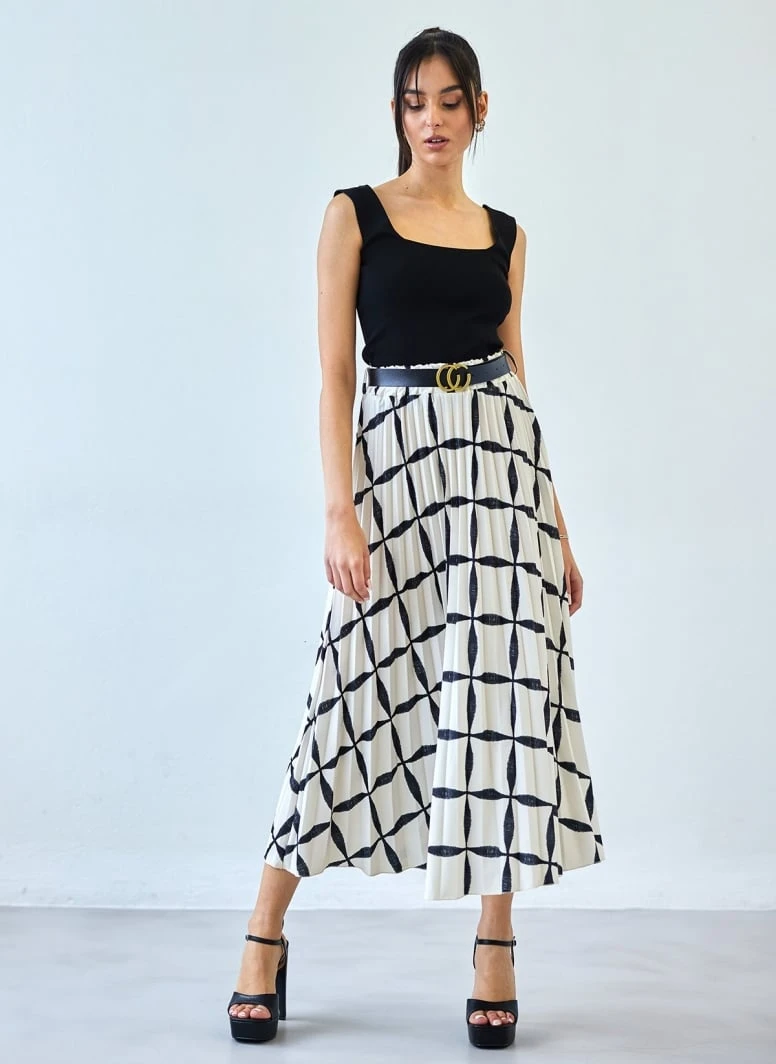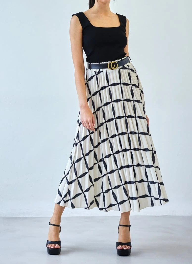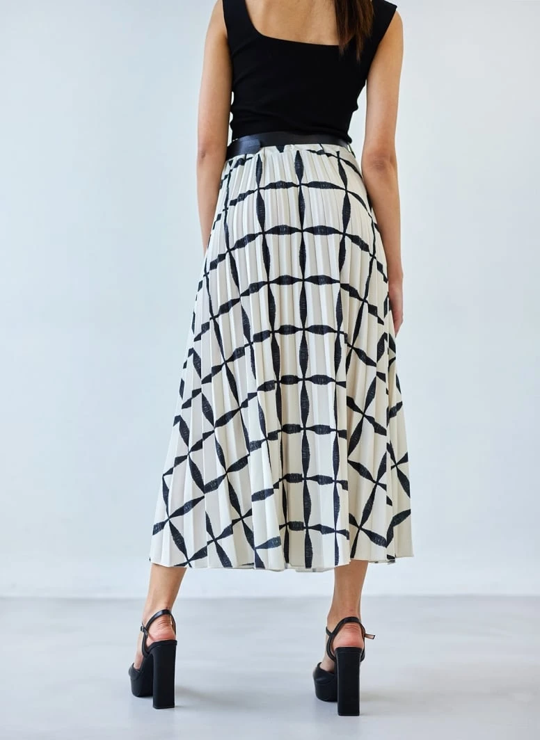 Ψηλόμεση φούστα πλισέ με print και λάστιχο στη μέση. Μίντι μάκρος. Περιλαμβάνεται ζώνη με μεταλλική αγκράφα. Made in Italy.