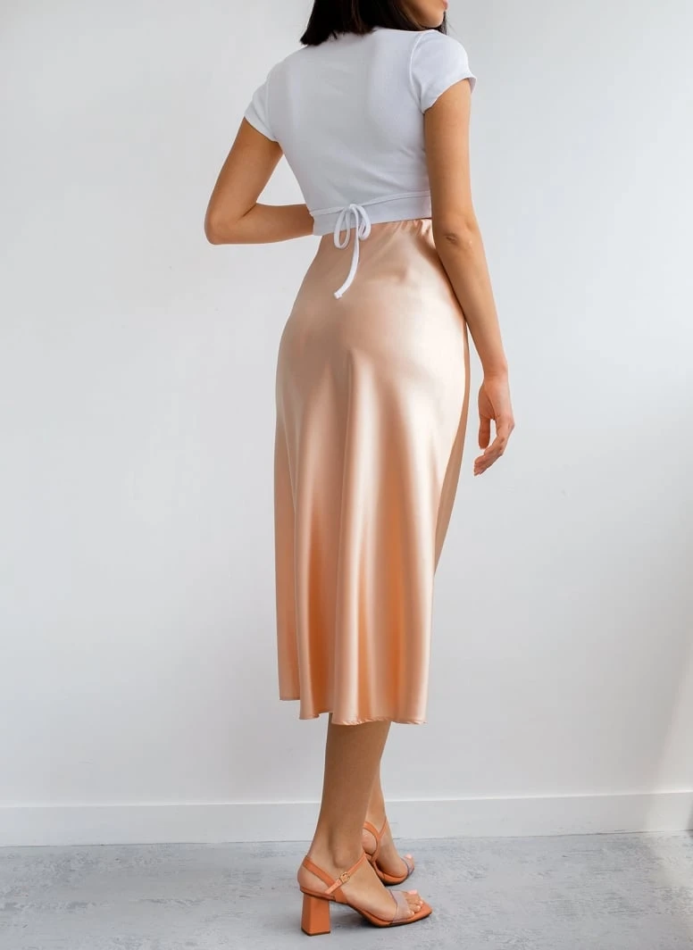Σατέν ψηλόμεση μίντι φούστα με λάστιχο στη μέση. Κλείνει με φερμουάρ στο πλάι.