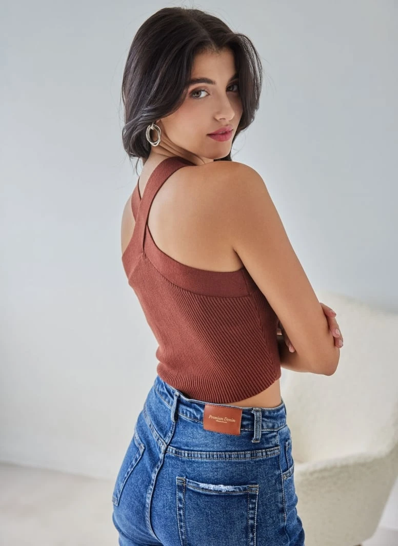 Μπλούζα με χιαστί halter λαιμόκοψη. Cropped εφαρμοστή γραμμή.