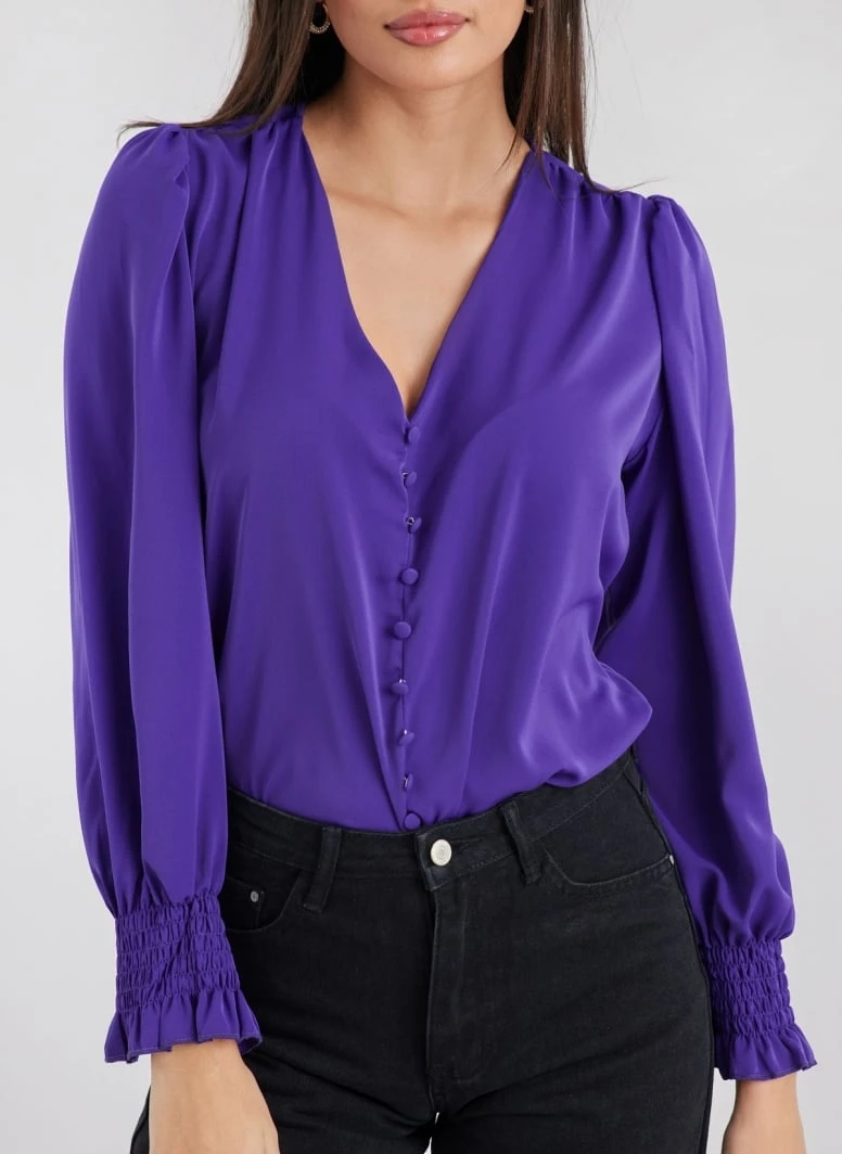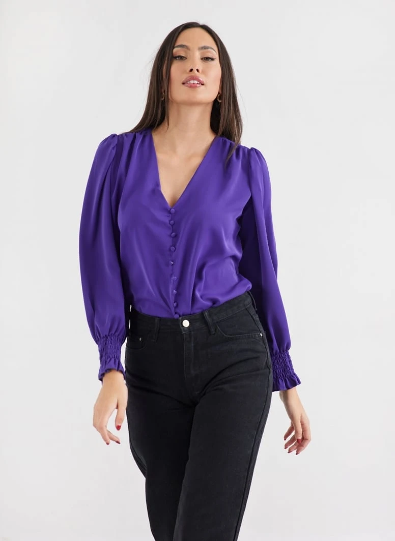 Μπλούζα λεπτή με εφέ μικρά κουμπιά. Έχει ελαστικό τελείωμα στα μανίκια. V cut λαιμόκοψη.Λεπτές σούρες στους ώμους. Ίσια γραμμή. Made in Italy.