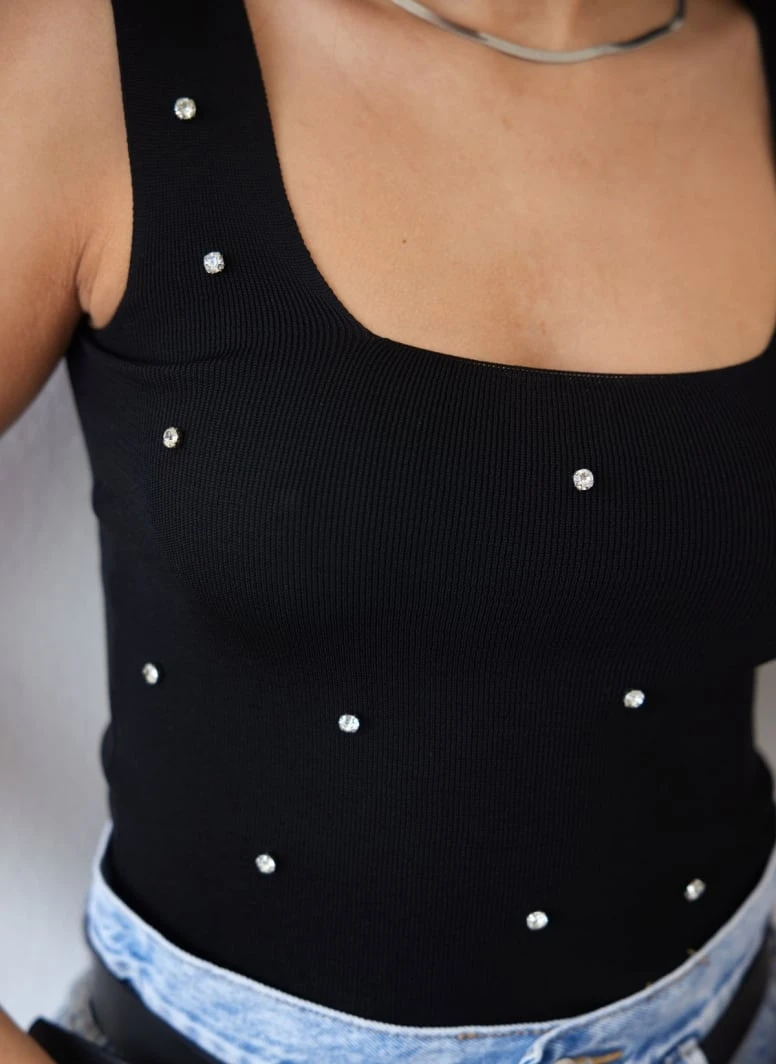 Μπλούζα αμάνικη με ύφανση ριμπ. Έχει στρας στη μπροστινή πλευρά. Καρέ λαιμόκοψη. Εφαρμοστή γραμμή.