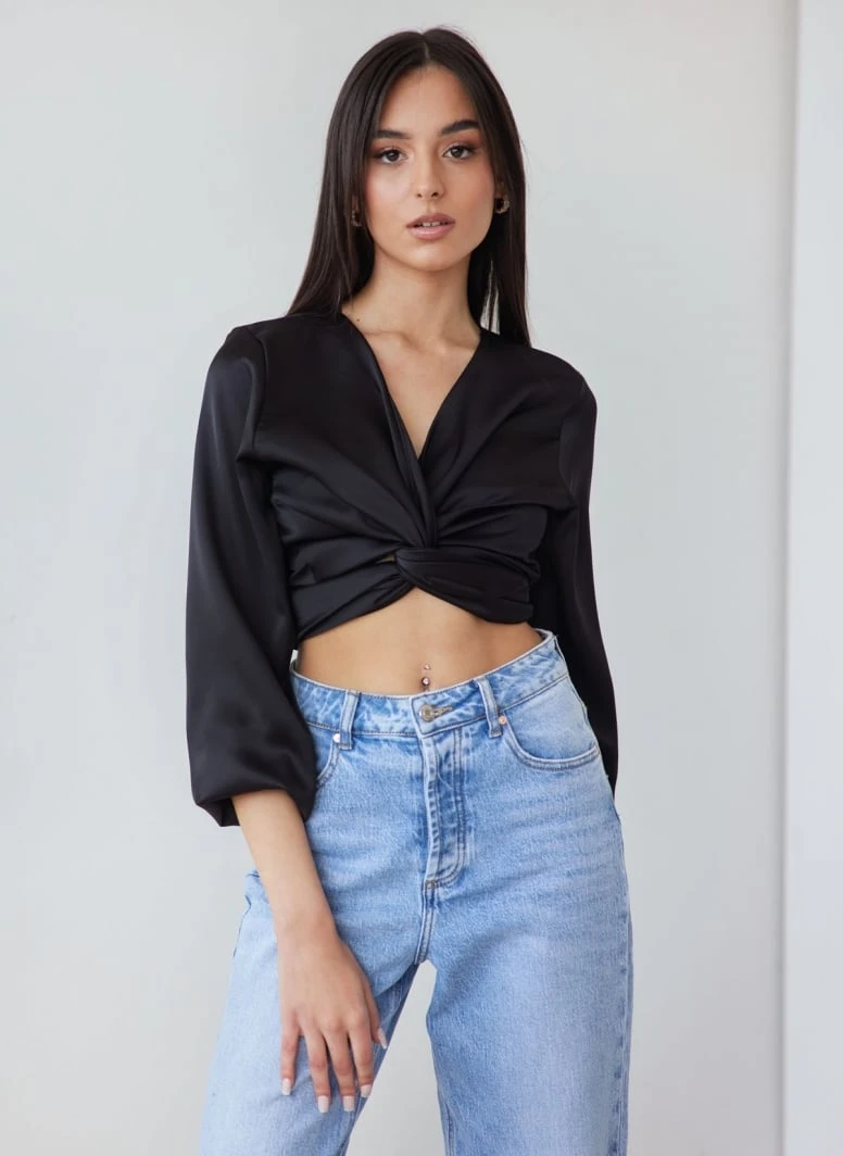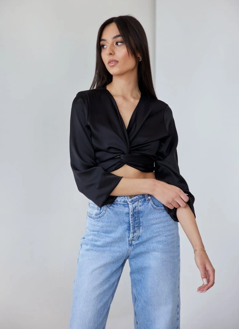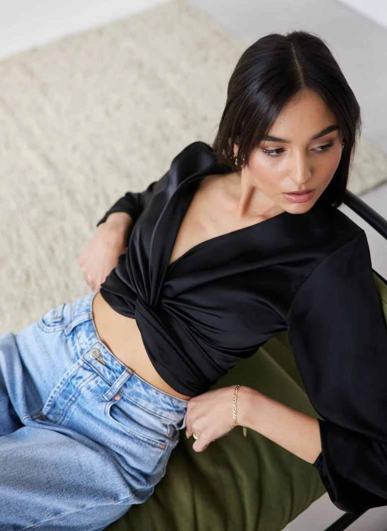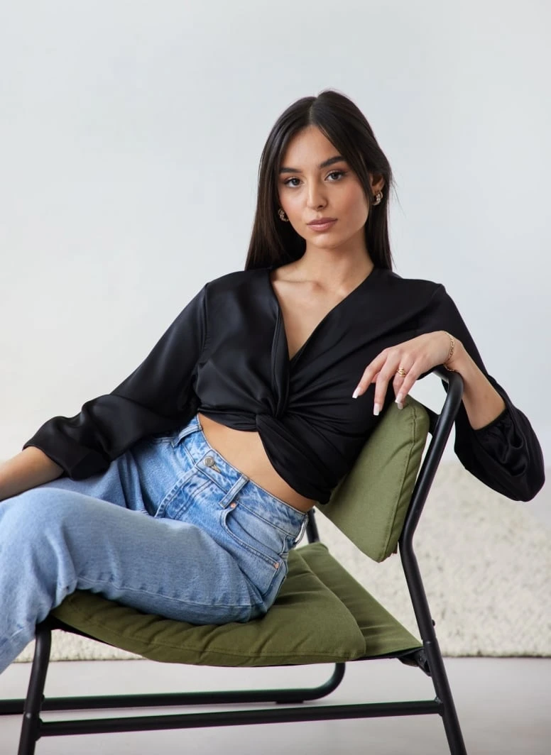 Μπλούζα μακρυμάνικη σατέν με δέσιμο. Έχει λάστιχο στα μανίκια. Made in Italy.