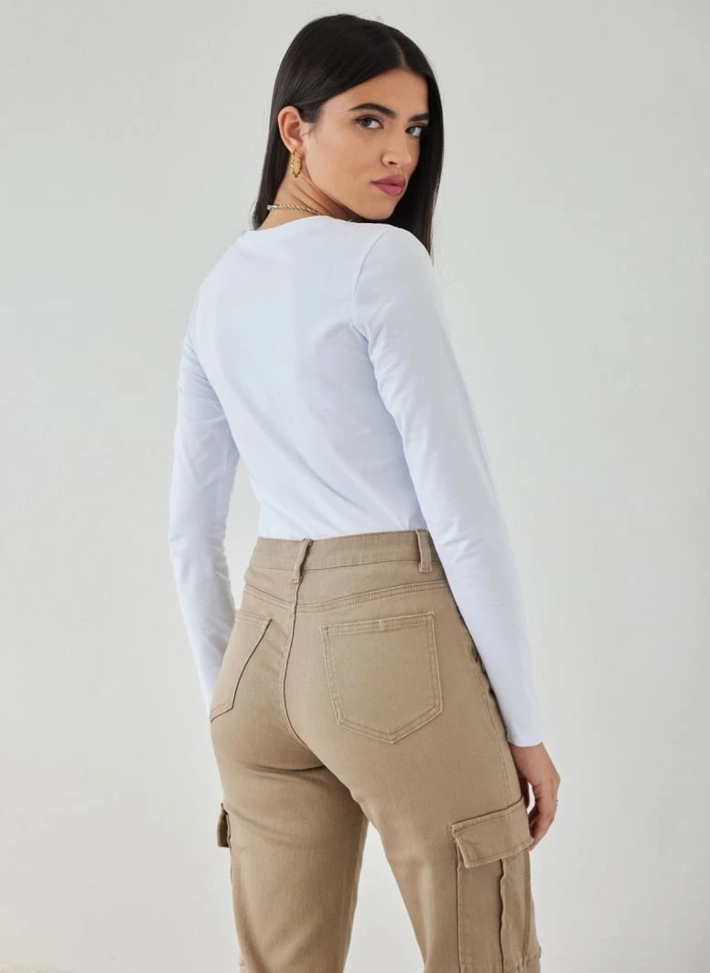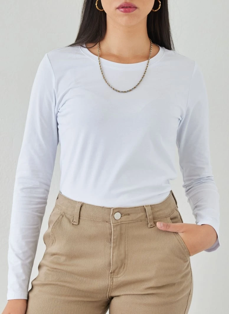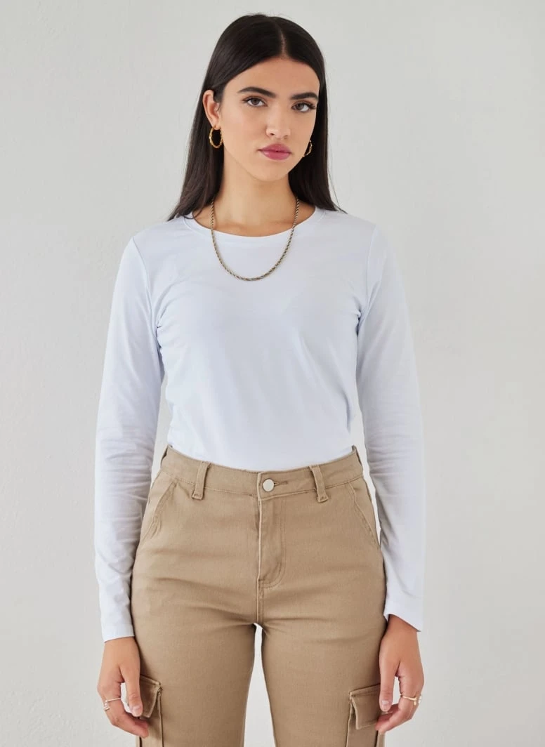 Μπλούζα basic βαμβακερή μακρυμάνικη σε ίσια γραμμή. Έχει ανοιχτή στρογγυλή λαιμόκοψη.