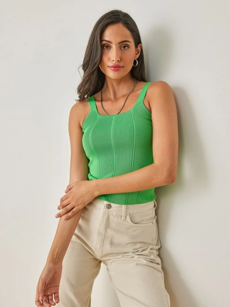 Εφαρμοστό μπλούζα με καρέ λαιμόκοψη και φαρδιές ράντες. Έχει σχέδιο ανάγλυφες ρίγες.