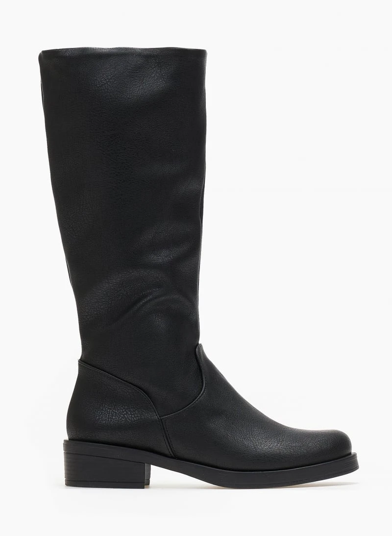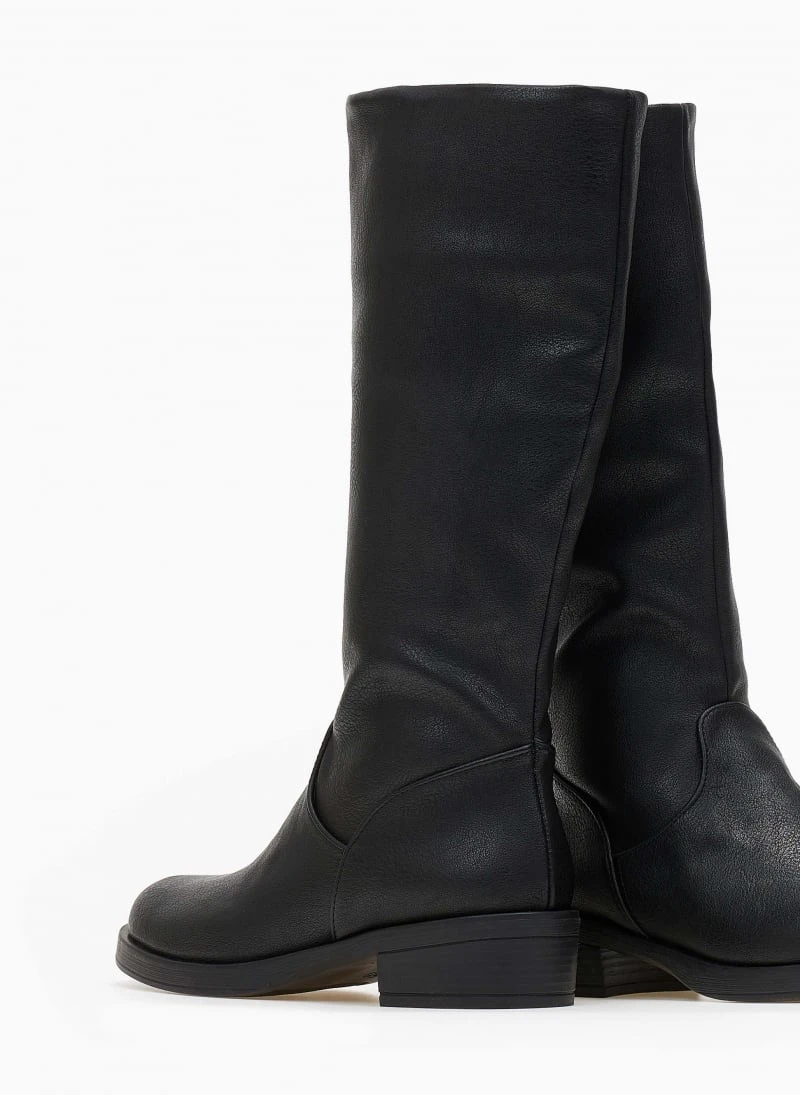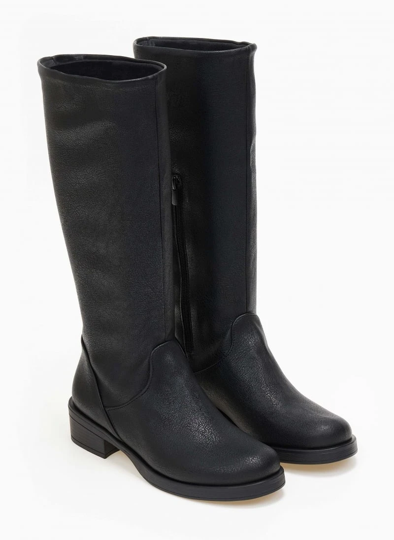 Μπότες φλατ σε στρογγυλή γραμμή. Φτάνουν στη μέση της γάμπας. Φερμουάρ στην εσωτερική τους πλευρά. Ελληνικής κατασκευής.