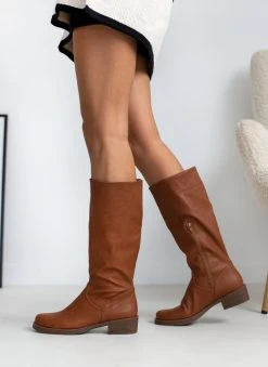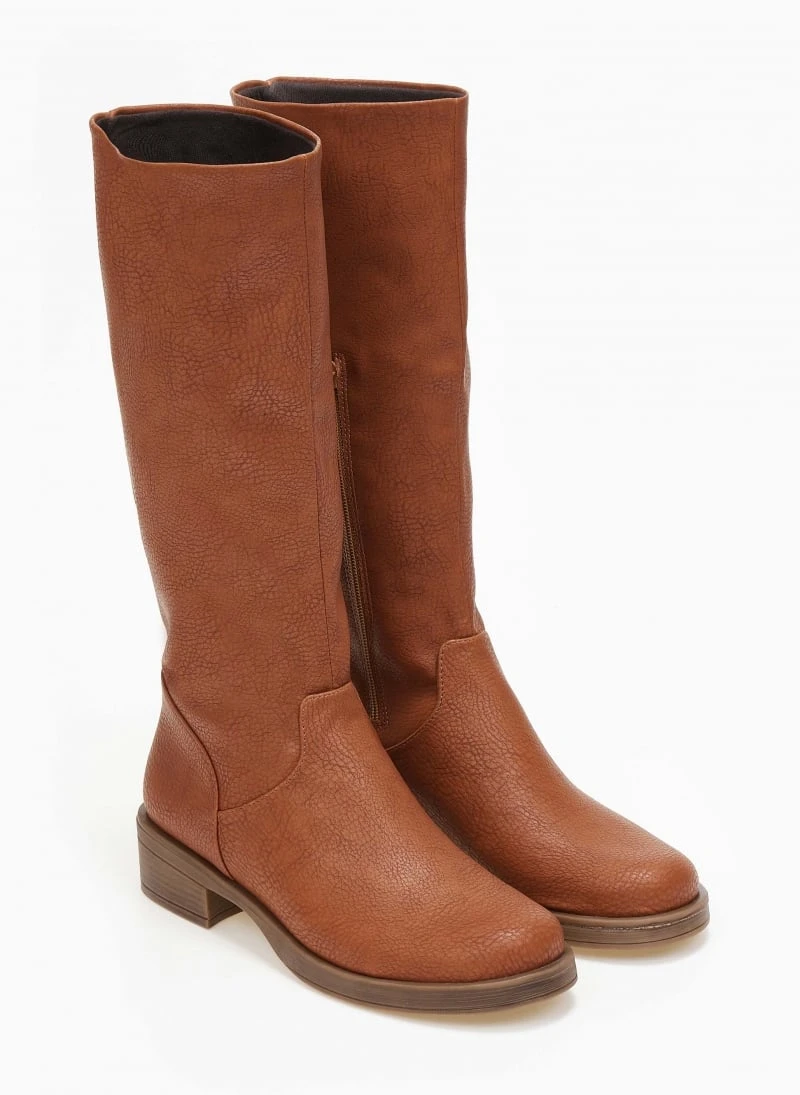 Μπότες φλατ σε στρογγυλή γραμμή. Φτάνουν στη μέση της γάμπας. Φερμουάρ στην εσωτερική τους πλευρά. Ελληνικής κατασκευής.