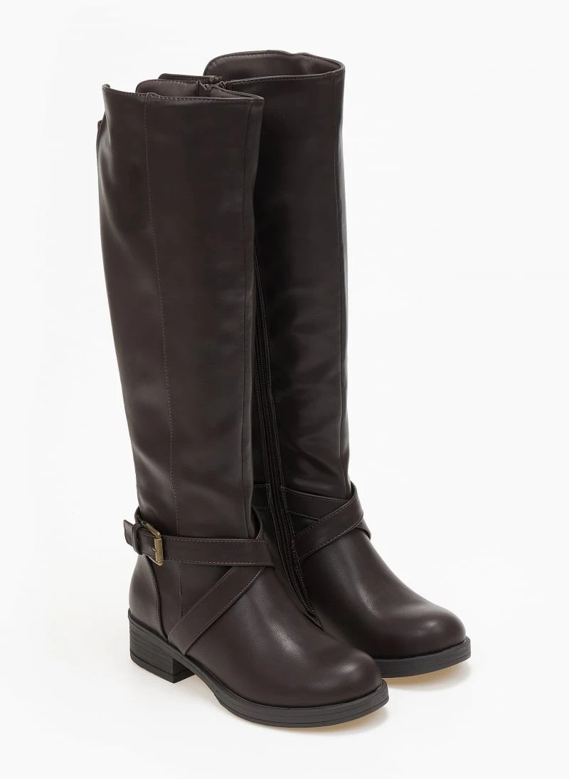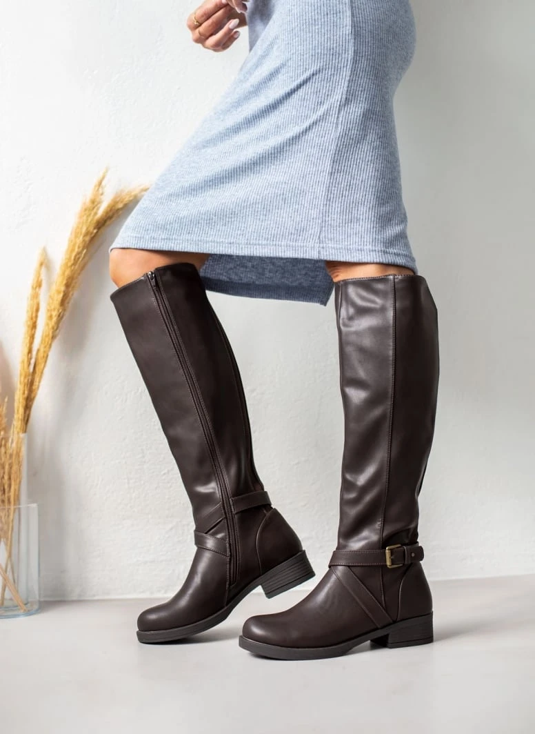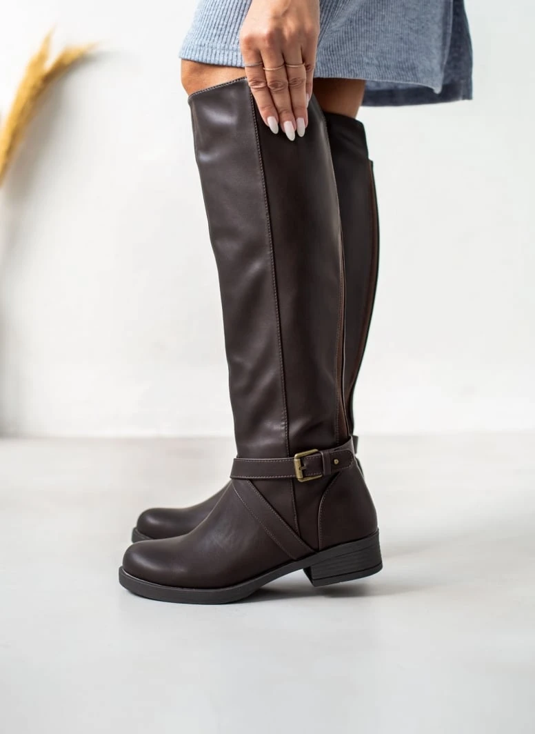Μπότες ιππασίας με ζωνάκι και μεταλλική αγκράφα. Έχουν λάστιχο στο πίσω μέρος για καλύτερη εφαρμογή. Ασύμμετρο τελείωμα.