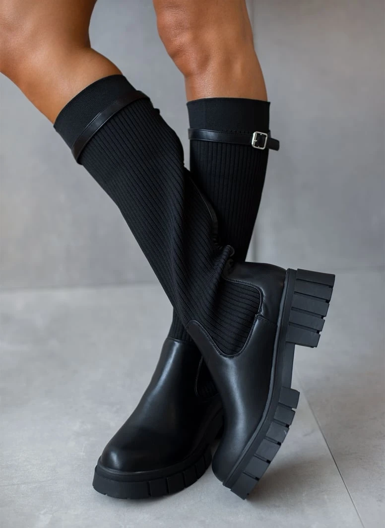 Μπότες με chunky σόλα. Έχουν σχέδιο κάλτσα στη γάμπα. Λεπτό ζωνάκι δερματίνη στο τελείωμα. Στρογγυλή φόρμα.