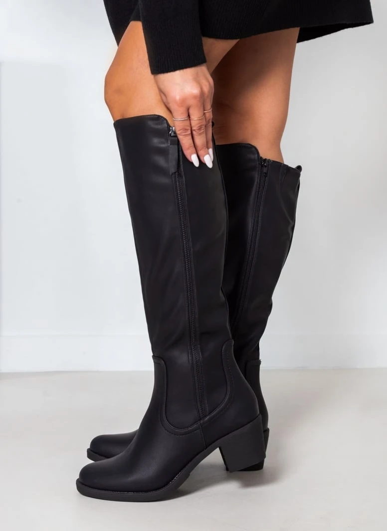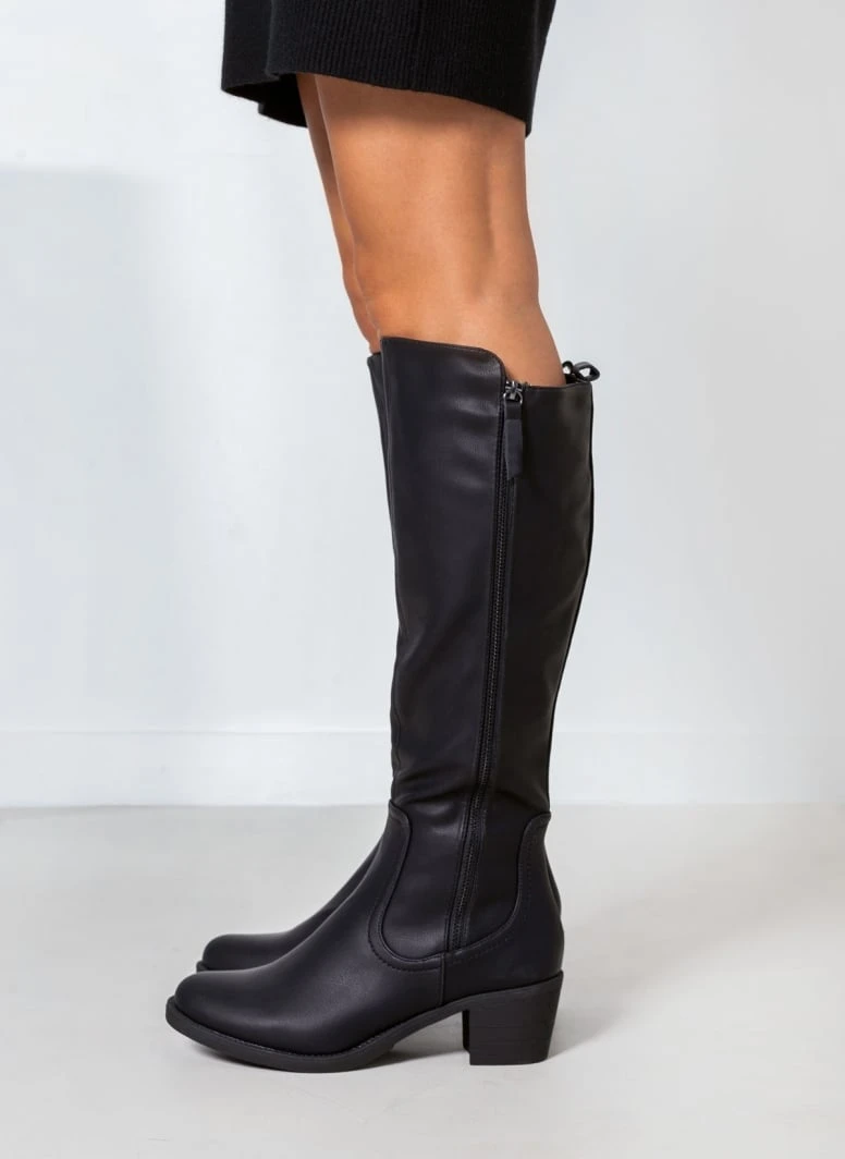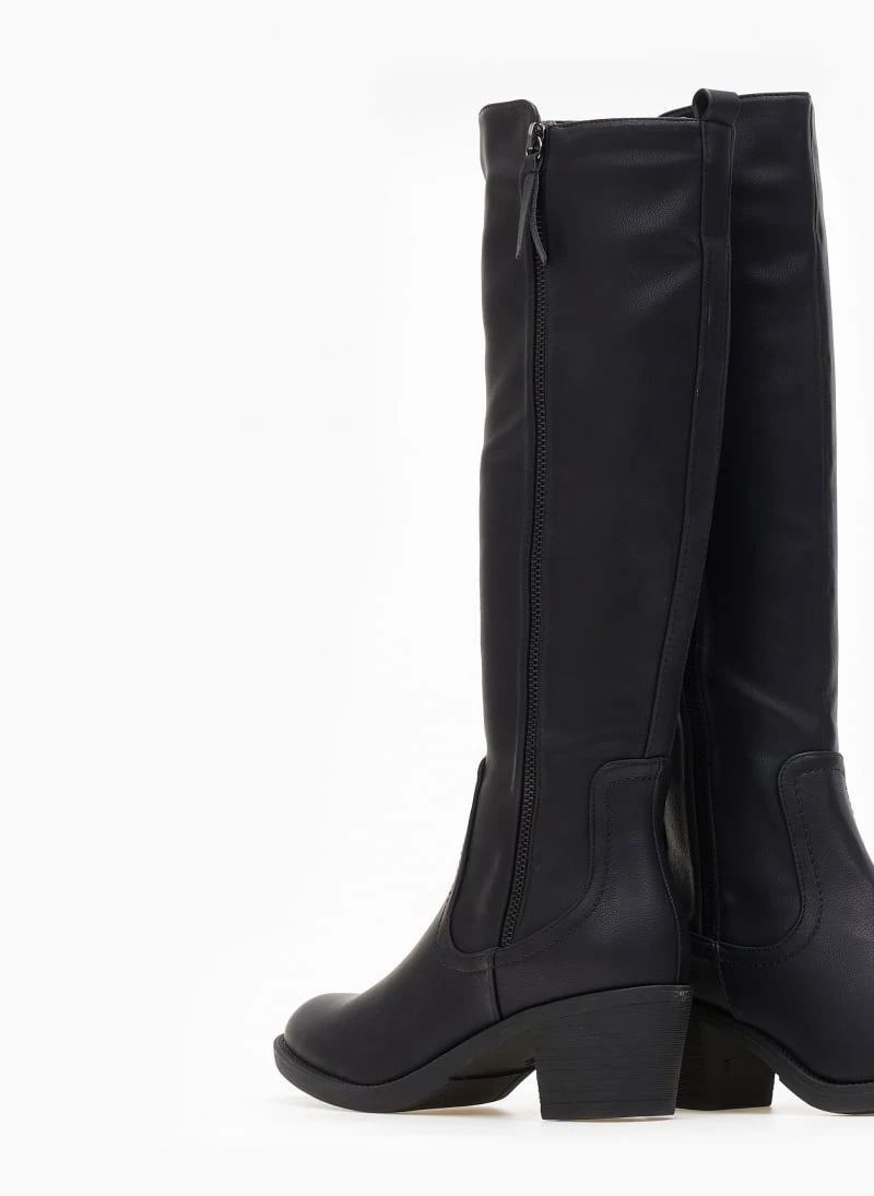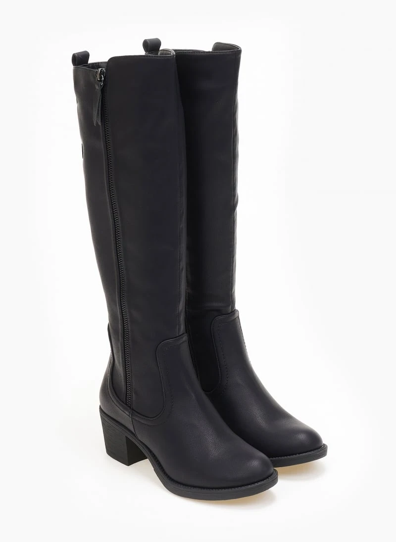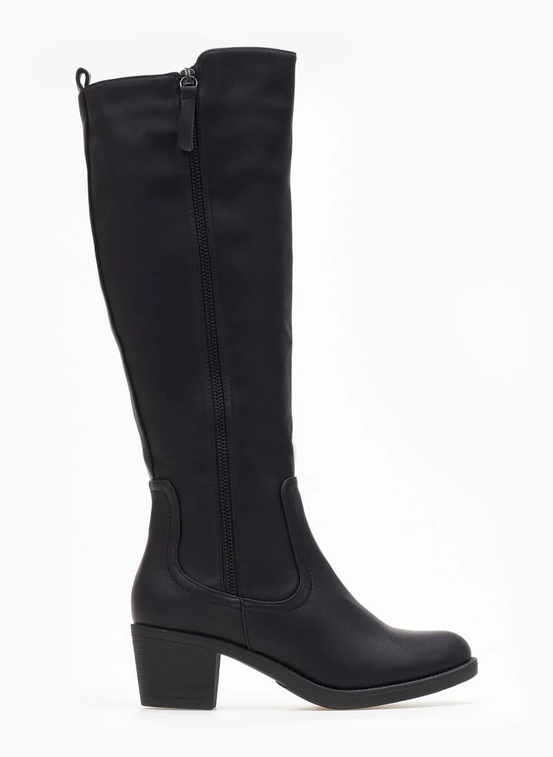 Μπότες σε στρογγυλή γραμμή με χαμηλό τακούνι. Έχουν διακοσμητικό φερμουάρ στην εξωτερική τους πλευρά. Διακριτικό άνοιγμα με λάστιχο στο επάνω μέρος για καλύτερη εφαρμογή.