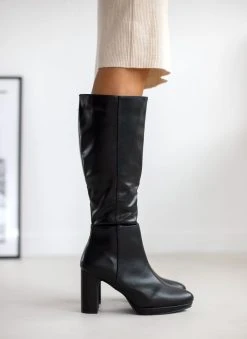 Μπότες με ψηλό τακούνι και λεπτή φιάπα. Έχουν κάθετη ραφή στο πλάι. Στρογγυλή φόρμα. Ελαστική γάμπα.
