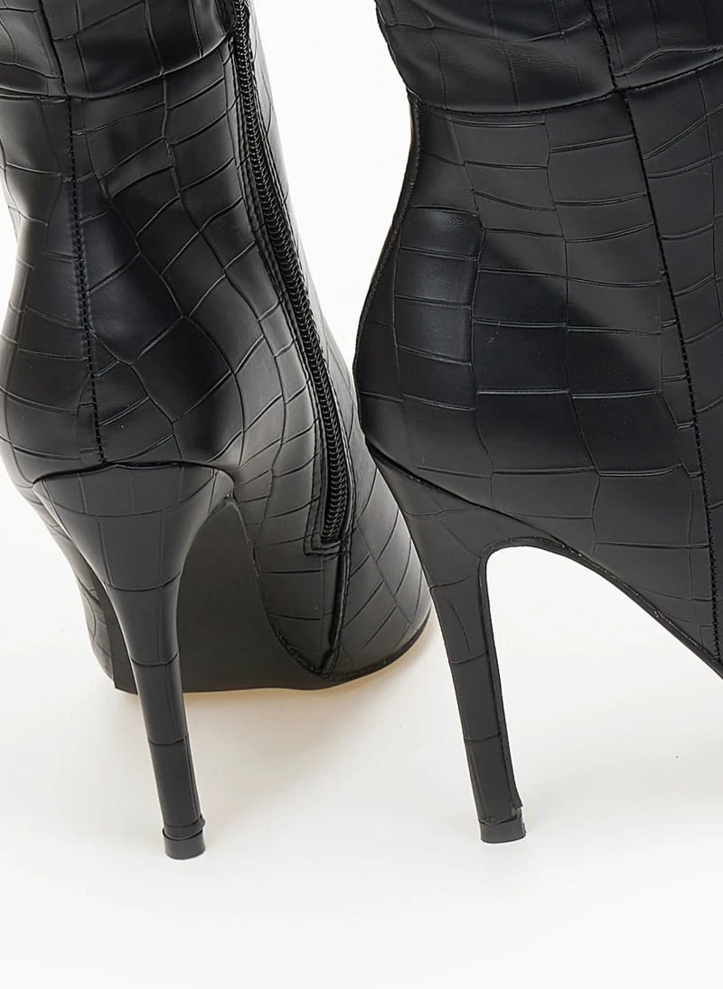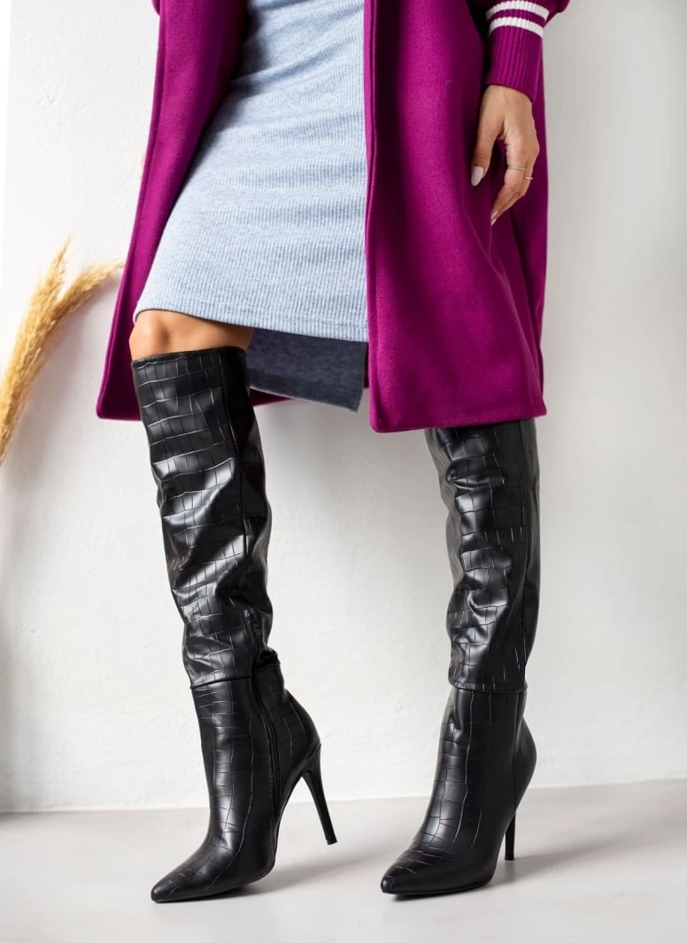 Μπότες πάνω από το γόνατο με pattern κροκό. Μυτερή φόρμα. Ψηλό λεπτό τακούνι.