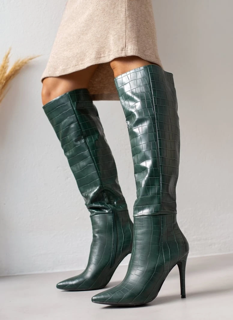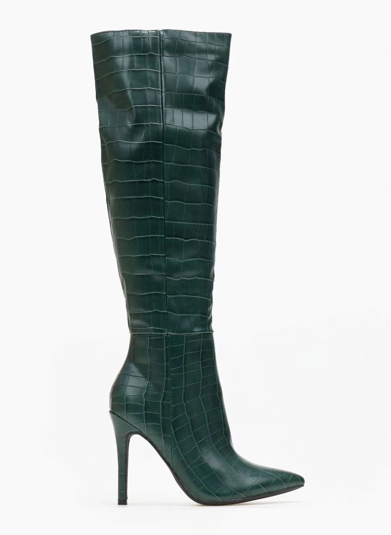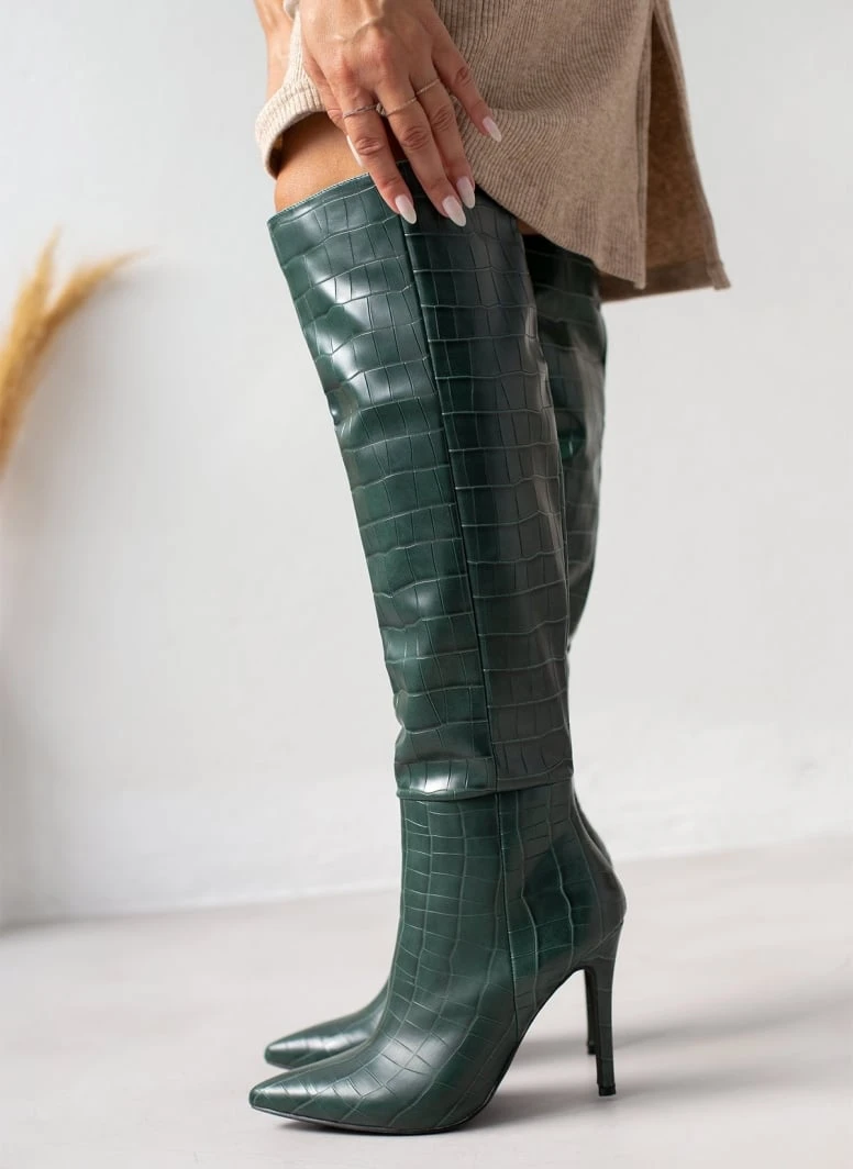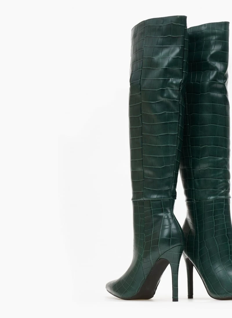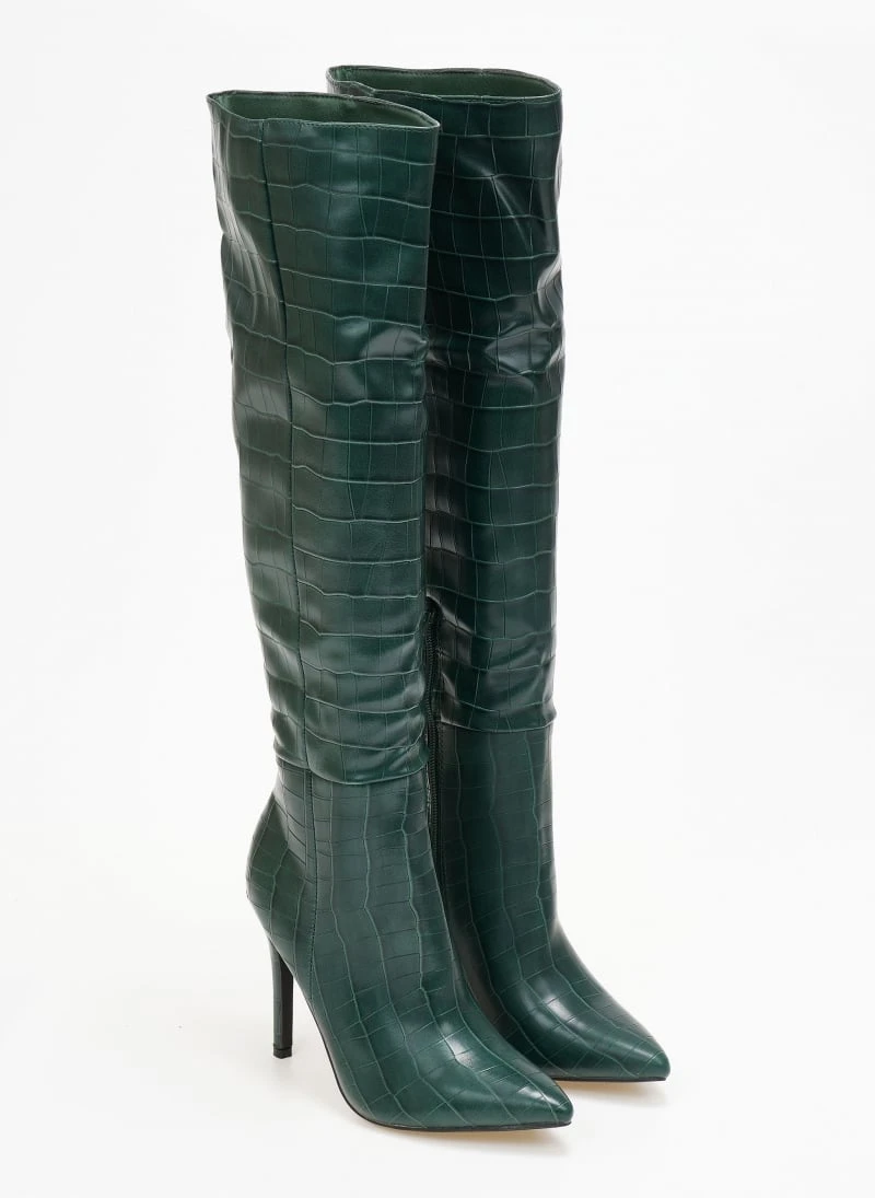 Μπότες πάνω από το γόνατο με pattern κροκό. Μυτερή φόρμα. Ψηλό λεπτό τακούνι.