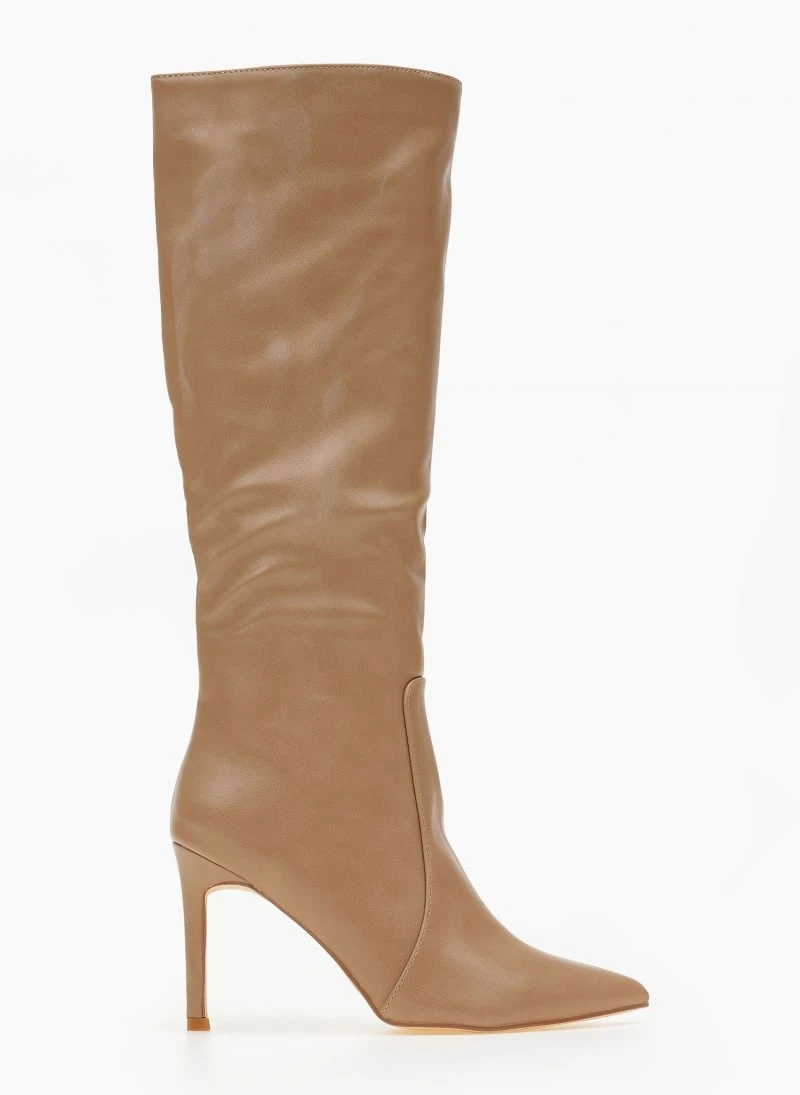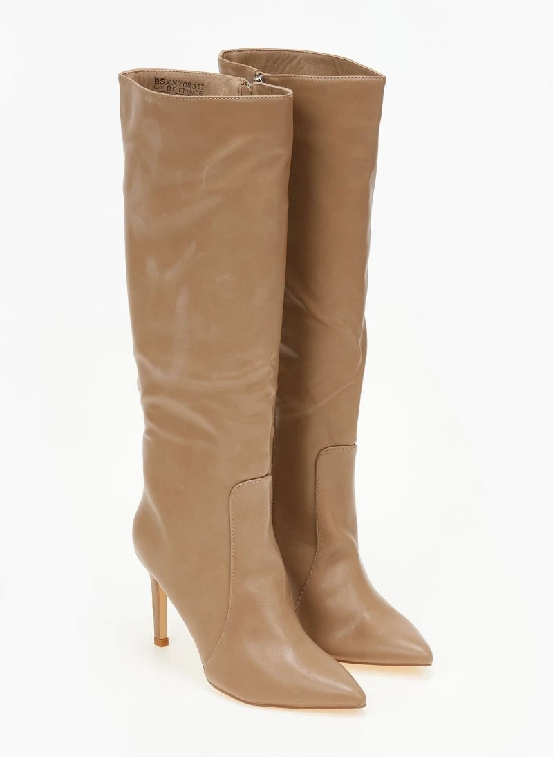 Ψηλή μπότα από τεχνόδερμα με τακούνι. Loose πάνω μέρος και μυτερό τελείωμα.