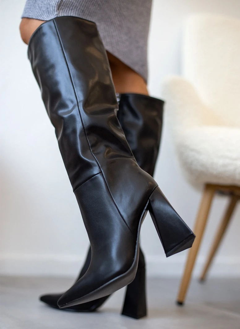 Μπότες με ψηλό τρίγωνο τακούνι. Έχουν κάθετη ραφή στην εξωτερική τους πλευρά. Μυτερή φόρμα.