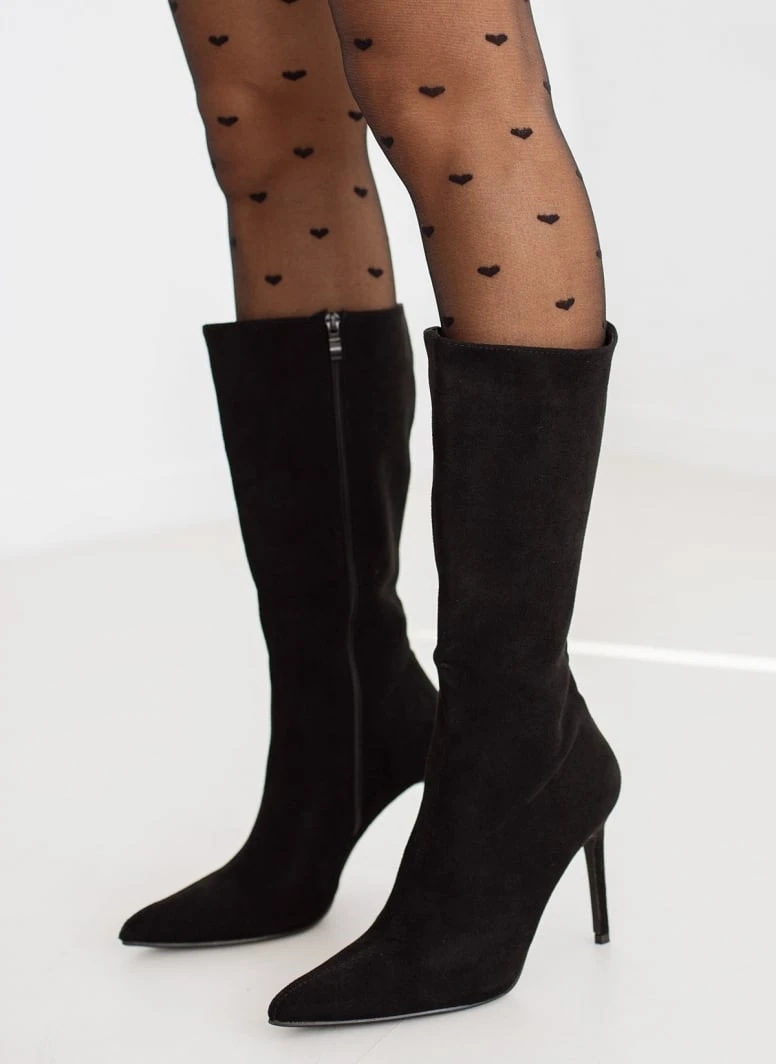 Μπότες suede με λεπτό τακούνι. Φτάνουν στη μέση της γάμπας. Μυτερή φόρμα.