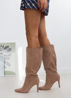 Μπότες suede με λεπτό ψηλό τακούνι. Έχουν άνετη γραμμή στη γάμπα. Κάθετη ραφή στο πλάι. Μυτερή φόρμα.
