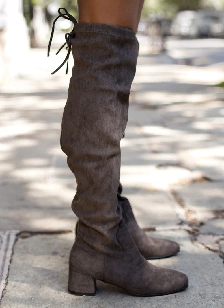 Μπότες casual πάνω από το γόνατο. Έχουν χαμηλό τετράγωνο τακούνι. Μικρό άνοιγμα στο πίσω μέρος με κορδόνι που σφίγγει.