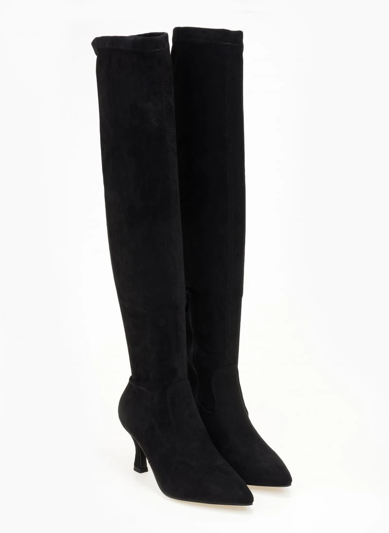 Μπότες μυτερές από suede με χαμηλό τακούνι. Είναι πάνω από το γόνατο και εσωτερικά κλείνουν με φερμουάρ.