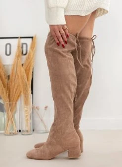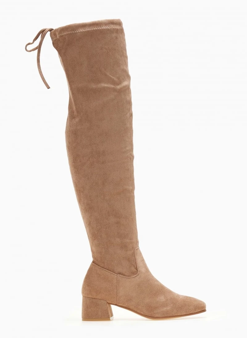 Μπότες casual πάνω από το γόνατο. Έχουν χαμηλό τετράγωνο τακούνι. Μικρό άνοιγμα στο πίσω μέρος με κορδόνι που σφίγγει.